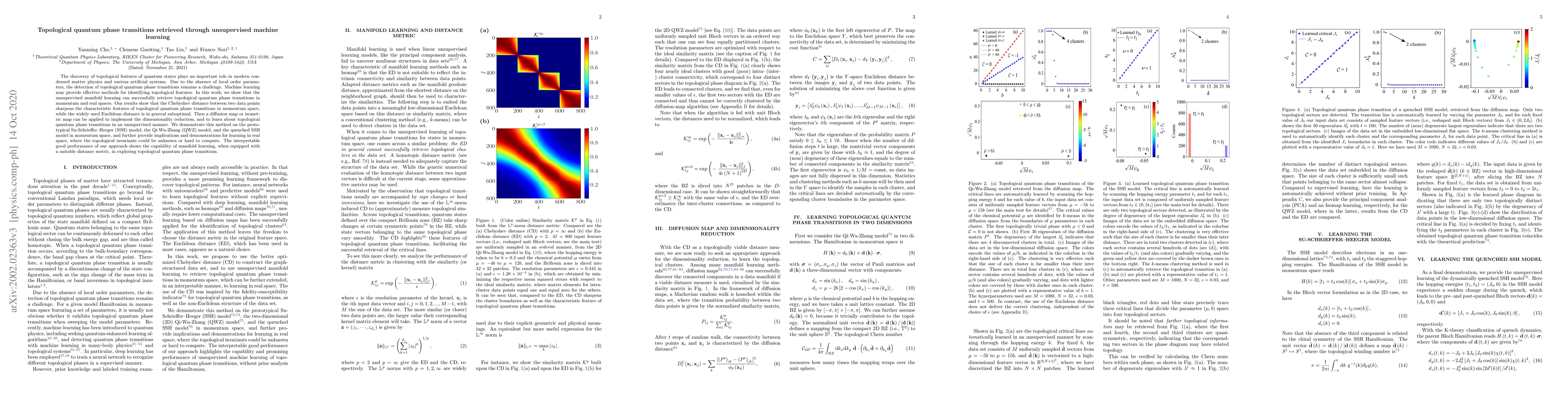 This paper demonstrates that unsupervised manifold learning techniques can effectively identify topological quantum phase transitions, overcoming the challenge of detecting these transitions without local order parameters. The study shows that the Chebyshev distance, combined with dimensionality reduction methods like diffusion maps, outperforms Euclidean distance in revealing topological features, particularly in momentum space.