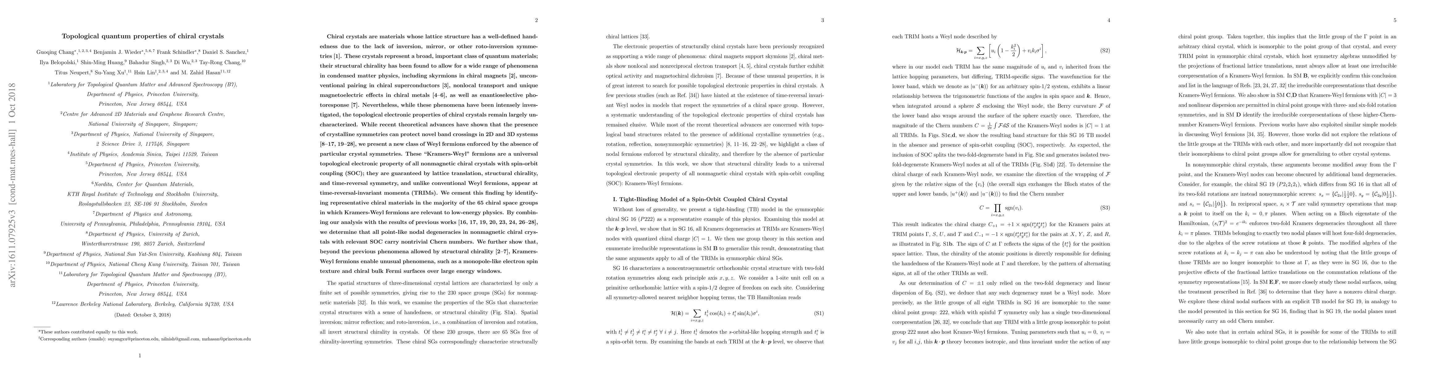 This paper explores the topological electronic properties of chiral crystals, revealing a new class of Weyl fermions called "Kramers-Weyl" fermions that arise due to the absence of specific crystal symmetries. These fermions are protected by lattice translation, structural chirality, and time-reversal symmetry, and appear at time-reversal-invariant momenta, leading to unique phenomena such as novel electron spin textures and chiral bulk Fermi surfaces.