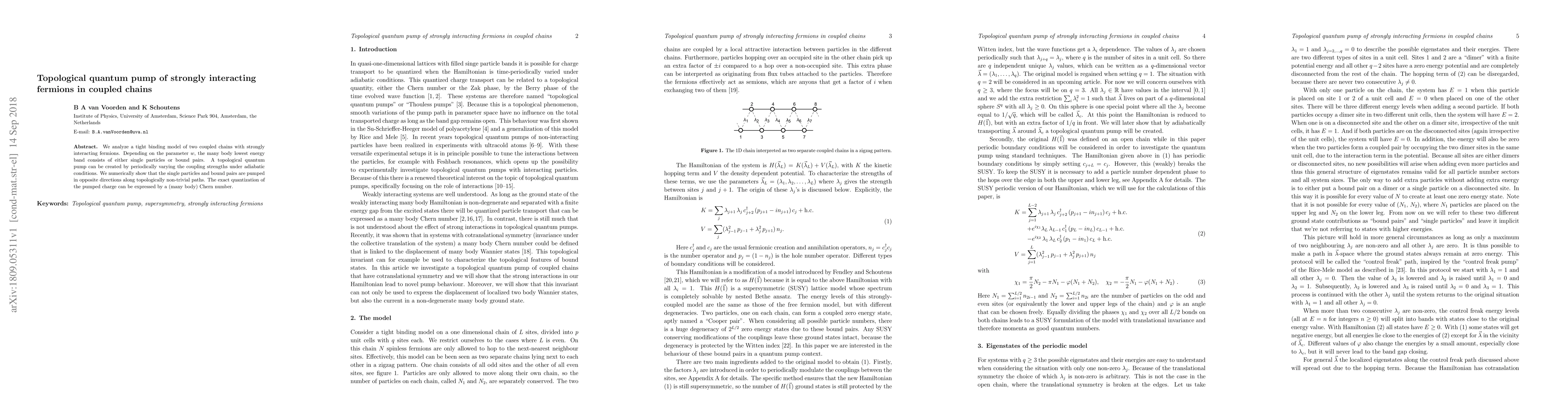 We analyze a tight binding model of two coupled chains with strongly interacting fermions. Depending on the parameter $w$, the many body lowest energy band consists of either single particles or bound pairs. A topological quantum pump can be created by periodically varying the coupling strengths under adiabatic conditions. We numerically show that the single particles and bound pairs are pumped in opposite directions along topologically non-trivial paths. The exact quantization of the pumped charge can be expressed by a (many body) Chern number.