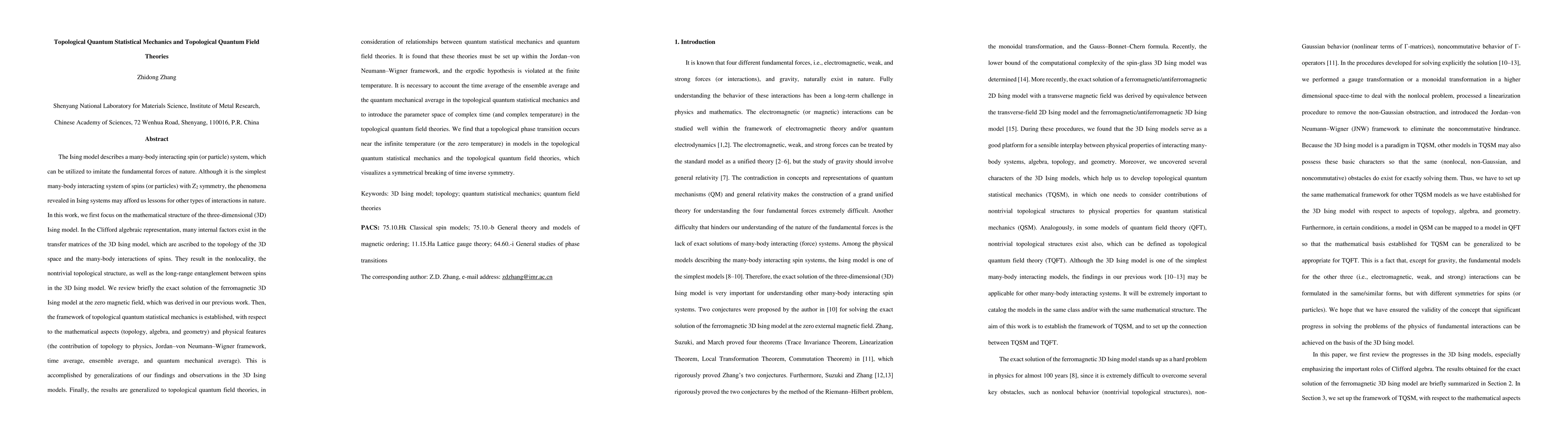 In this work, we first focus on the mathematical structure of the three-dimensional (3D) Ising model. In the Clifford algebraic representation, many internal factors exist in the transfer matrices of the 3D Ising model, which are ascribed to the topology of the 3D space and the many-body interactions of spins. They result in the nonlocality, the nontrivial topological structure, as well as the long-range entanglement between spins in the 3D Ising model. We review briefly the exact solution of the ferromagnetic 3D Ising model at the zero magnetic field, which was derived in our previous work. Then, the framework of topological quantum statistical mechanics is established, with respect to the mathematical aspects (topology, algebra, and geometry) and physical features (the contribution of topology to physics, Jordan-von Neumann-Wigner framework, time average, ensemble average, and quantum mechanical average). This is accomplished by generalizations of our findings and observations in the 3D Ising models. Finally, the results are generalized to topological quantum field theories, in consideration of relationships between quantum statistical mechanics and quantum field theories. It is found that these theories must be set up within the Jordan-von Neumann-Wigner framework, and the ergodic hypothesis is violated at the finite temperature. It is necessary to account the time average of the ensemble average and the quantum mechanical average in the topological quantum statistical mechanics and to introduce the parameter space of complex time (and complex temperature) in the topological quantum field theories. We find that a topological phase transition occurs near the infinite temperature (or the zero temperature) in models in the topological quantum statistical mechanics and the topological quantum field theories, which visualizes a symmetrical breaking of time inverse symmetry.