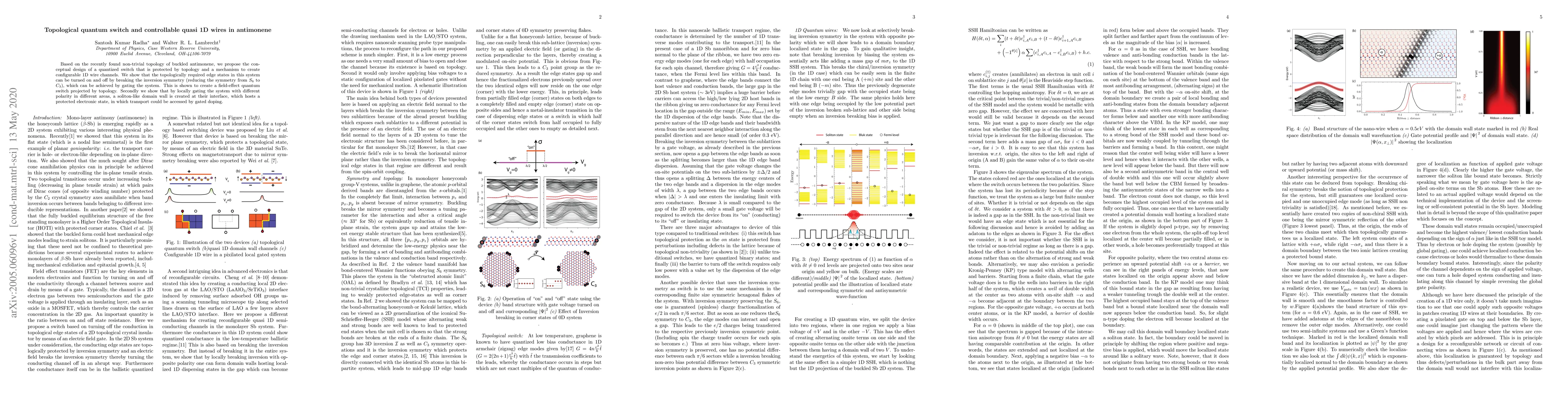Based on the recently found non-trivial topology of buckled antimonene, we propose the conceptual design of a quantized switch that is protected by topology and a mechanism to create configurable 1D wire channels. We show that the topologically required edge states in this system can be turned on and off by breaking the inversion symmetry (reducing the symmetry from $S_6$ to $C_3$), which can be achieved by gating the system. This is shown to create a field-effect quantum switch projected by topology. Secondly we show that by locally gating the system with different polarity in different areas, a soliton-like domain wall is created at their interface, which hosts a protected electronic state, in which transport could be accessed by gated doping.