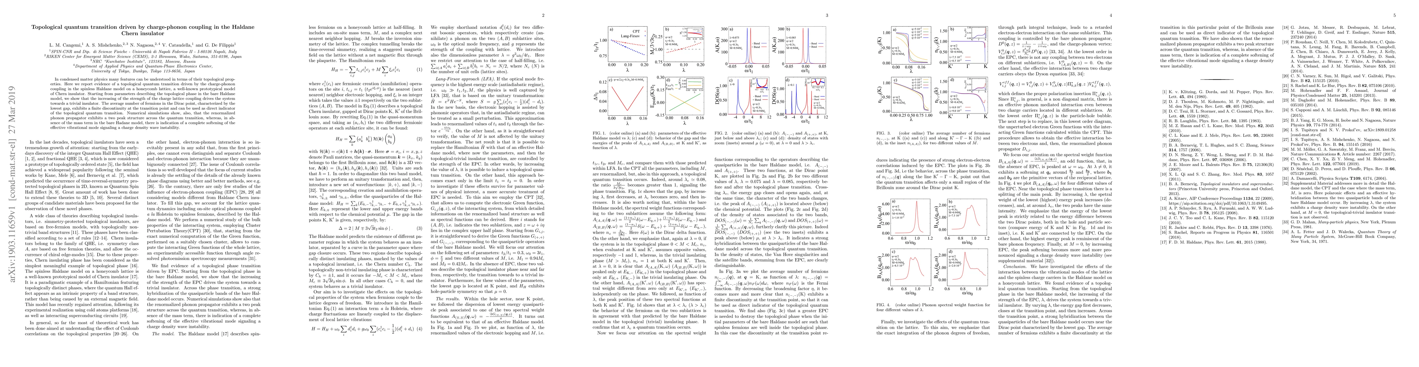 This paper explores a topological quantum transition in the Haldane Chern insulator driven by charge-phonon coupling, demonstrating a finite discontinuity in the average number of fermions at the transition point. Numerical simulations reveal a two-peak structure in the renormalized phonon propagator across the transition, indicating a charge density wave instability.