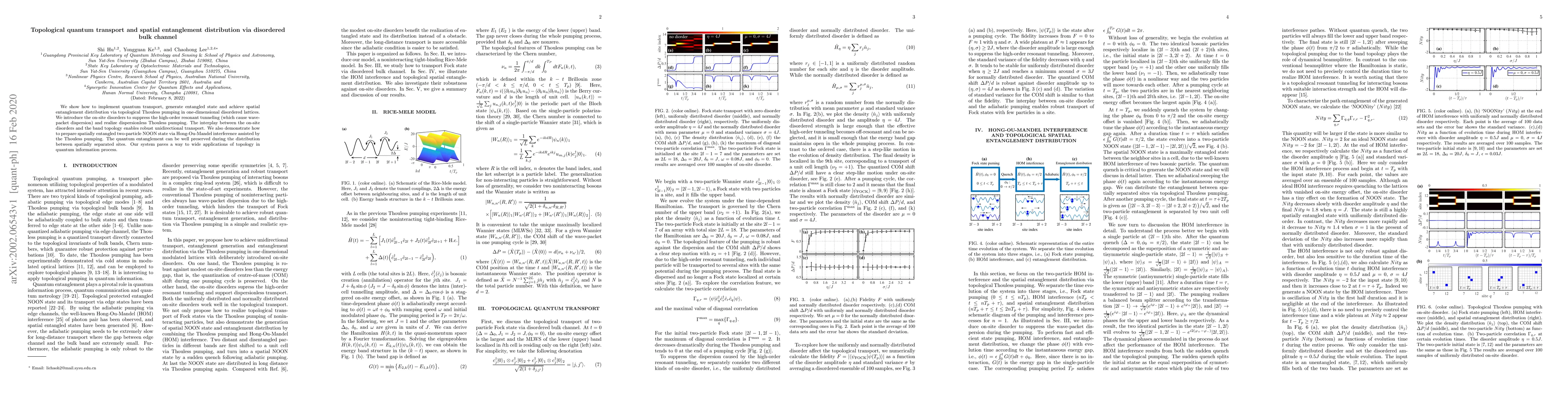 This paper demonstrates topological quantum transport and spatial entanglement distribution in one-dimensional disordered lattices using Thouless pumping. It shows how on-site disorders enable robust, dispersionless transport and prepares entangled NOON states, preserving quantum entanglement during distribution.