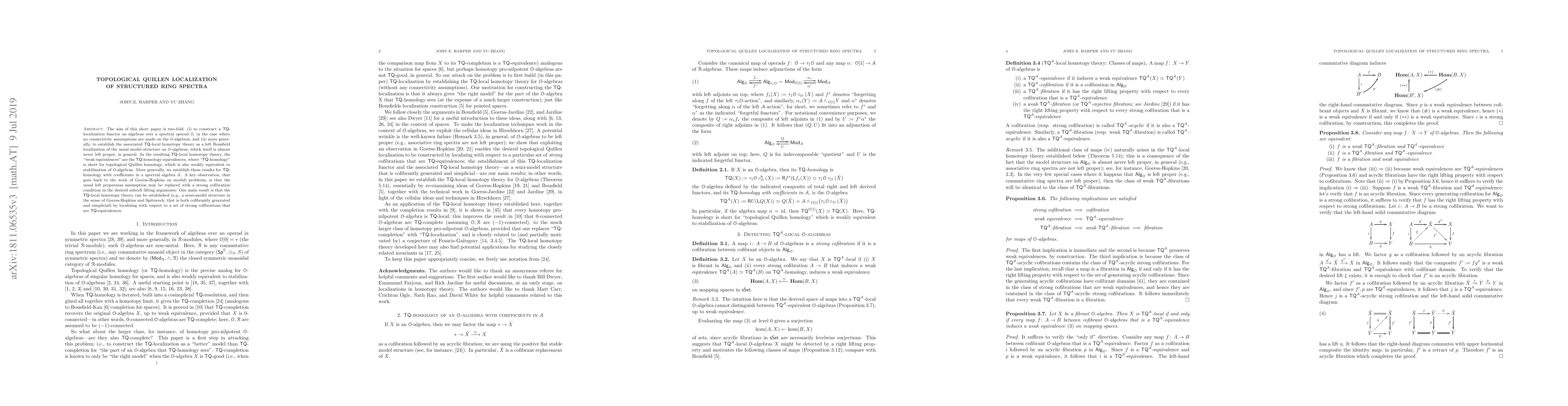 The aim of this short paper is two-fold: (i) to construct a TQ-localization functor on algebras over a spectral operad O, in the case where no connectivity assumptions are made on the O-algebras, and (ii) more generally, to establish the associated TQ-local homotopy theory as a left Bousfield localization of the usual model structure on O-algebras, which itself is almost never left proper, in general. In the resulting TQ-local homotopy theory, the "weak equivalences" are the TQ-homology equivalences, where "TQ-homology" is short for topological Quillen homology, which is also weakly equivalent to stabilization of O-algebras. More generally, we establish these results for TQ-homology with coefficients in a spectral algebra A. A key observation, that goes back to the work of Goerss-Hopkins on moduli problems, is that the usual left properness assumption may be replaced with a strong cofibration condition in the desired subcell lifting arguments: Our main result is that the TQ-local homotopy theory can be established (e.g., a semi-model structure in the sense of Goerss-Hopkins and Spitzweck, that is both cofibrantly generated and simplicial) by localizing with respect to a set of strong cofibrations that are TQ-equivalences.