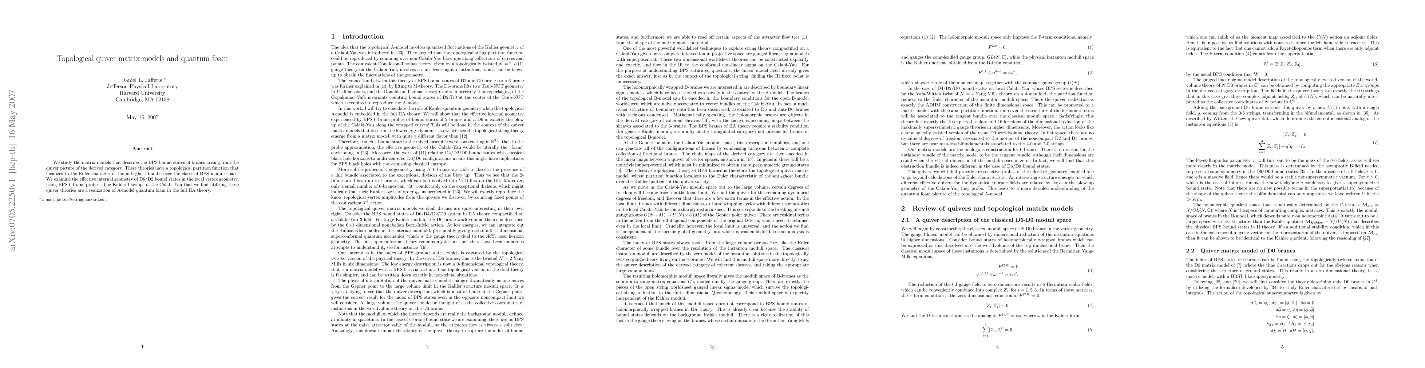 We study the matrix models that describe the BPS bound states of branes arising from the quiver picture of the derived category. These theories have a topological partition function that localizes to the Euler character of the anti-ghost bundle over the classical BPS moduli space. We examine the effective internal geometry of D6/D2 bound states in the local vertex geometry, using BPS 0-brane probes. The Kahler blowups of the Calabi-Yau that we find utilizing these quiver theories are a realization of A-model quantum foam in the full IIA theory.