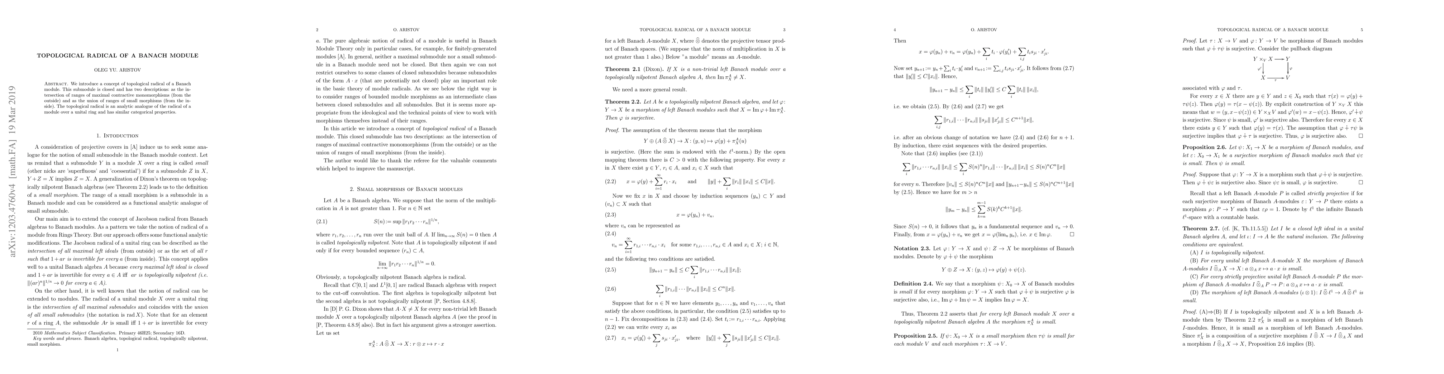 We introduce the concept of topological radical of a Banach module. This closed submodule have two description: the as the intersection of ranges of maximal contractive monomorphism (from outside) and as the union of ranges of small morphisms (from inside). This concept is a functional analytic analogue for radical of module over a unital ring and has the similar categorical properties.