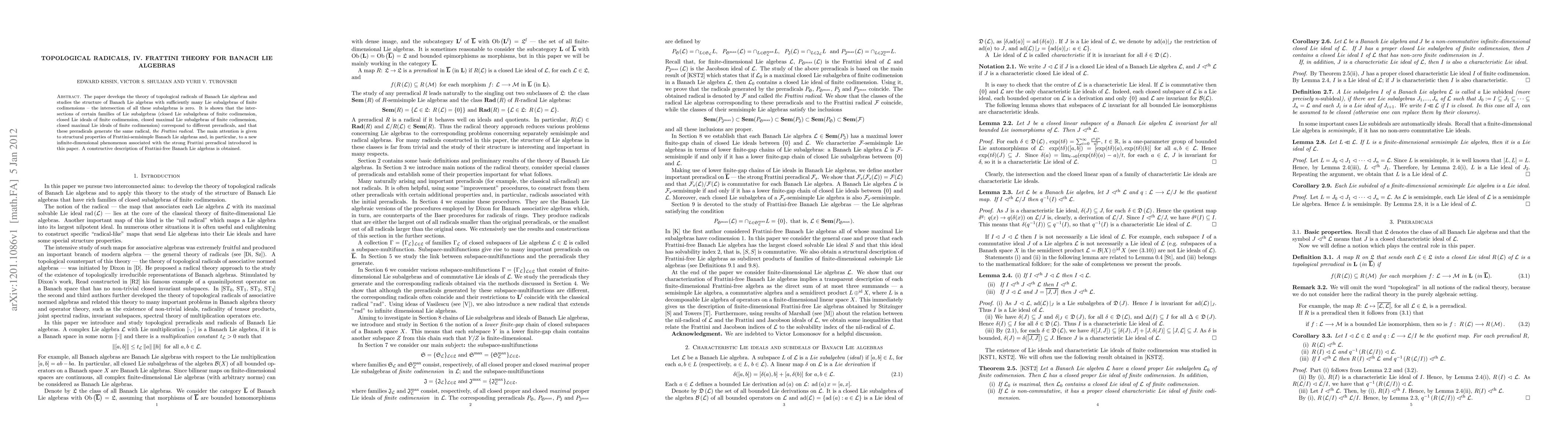 This paper explores the topological radicals and Frattini theory in Banach Lie algebras, showing that intersections of specific families of Lie subalgebras yield different preradicals that converge to the Frattini radical. It focuses on structural properties of Frattini-semisimple Banach Lie algebras and presents a new phenomenon related to a strong Frattini preradical.