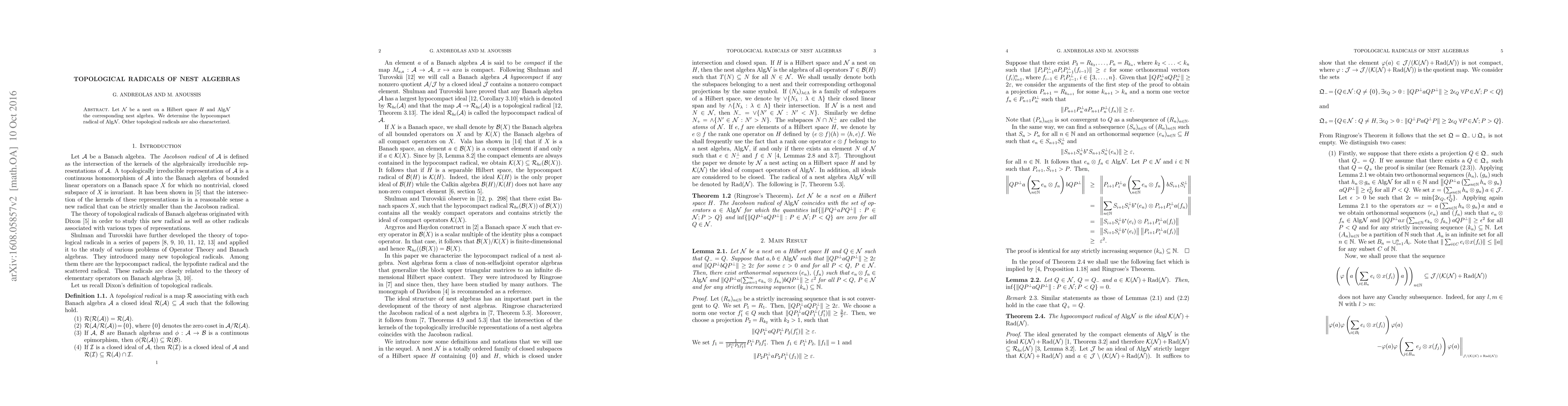 This research identifies the hypocompact radical of nest algebras derived from a nest N on a Hilbert space H and characterizes other topological radicals associated with these algebras.