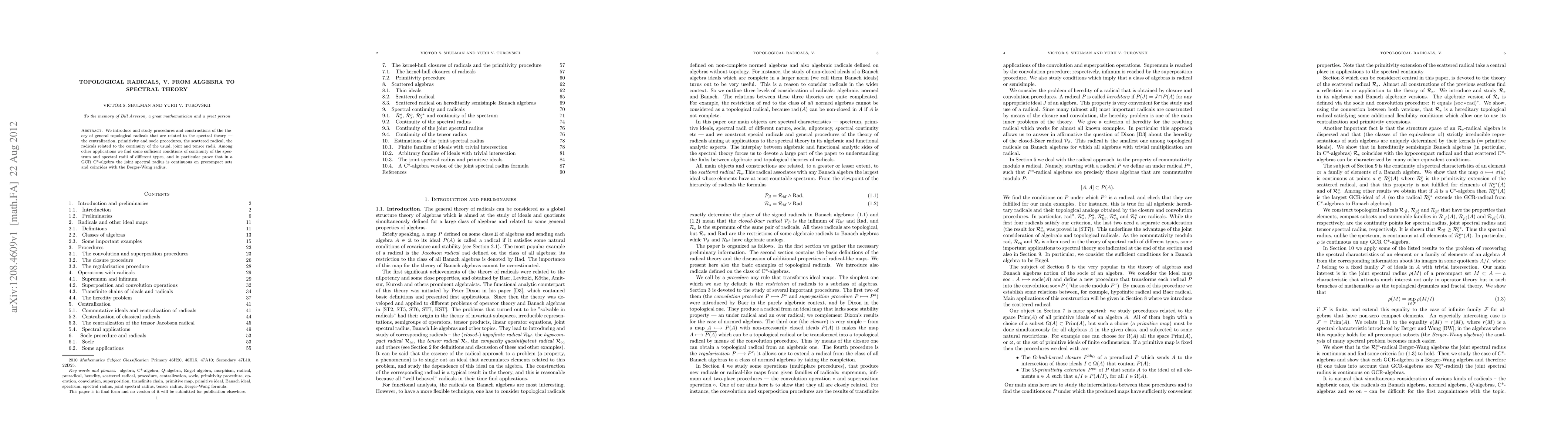 We introduce and study procedures and constructions in the theory of the joint spectral radius that are related to the spectral theory. In particular we devlop the theory of the scattered radical. Among applications we find some sufficient conditions of continuity of the spectrum and spectral radii of various types, and prove that in GCR C*-algebras the joint spectral radius is continuous on precompact subsets and coincides with the Berger-Wang radius.