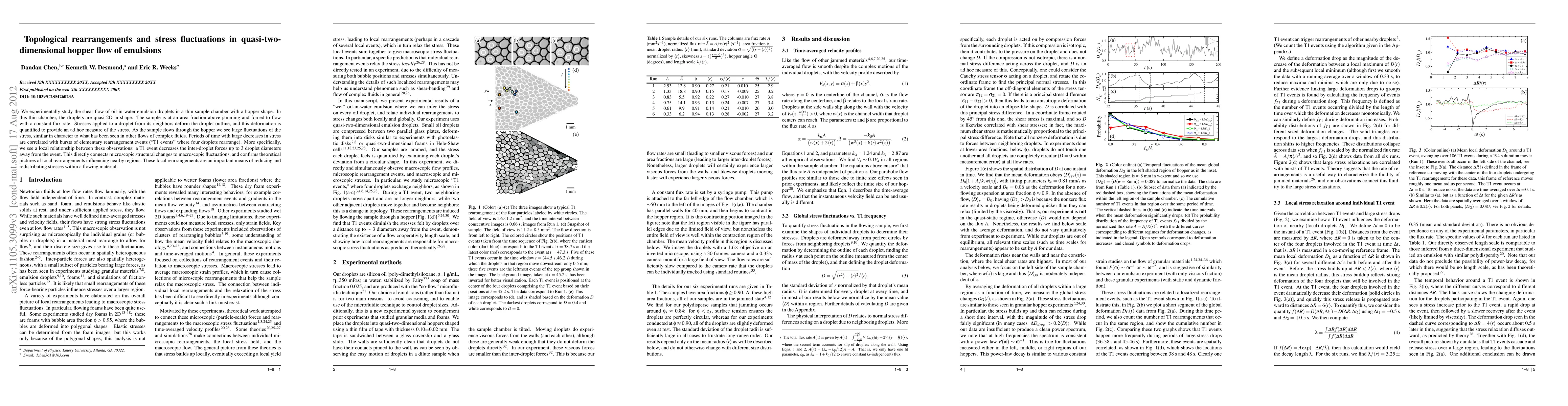 We experimentally study the shear flow of oil-in-water emulsion droplets in a thin sample chamber with a hopper shape. In this thin chamber, the droplets are quasi-2D in shape. The sample is at an area fraction above jamming and forced to flow with a constant flux rate. Stresses applied to a droplet from its neighbors deform the droplet outline, and this deformation is quantified to provide an ad hoc measure of the stress. As the sample flows through the hopper we see large fluctuations of the stress, similar in character to what has been seen in other flows of complex fluids. Periods of time with large decreases in stress are correlated with bursts of elementary rearrangement events ("T1 events" where four droplets rearrange). More specifically, we see a local relationship between these observations: a T1 event decreases the inter-droplet forces up to 3 droplet diameters away from the event. This directly connects microscopic structural changes to macroscopic fluctuations, and confirms theoretical pictures of local rearrangements influencing nearby regions. These local rearrangements are an important means of reducing and redistributing stresses within a flowing material.