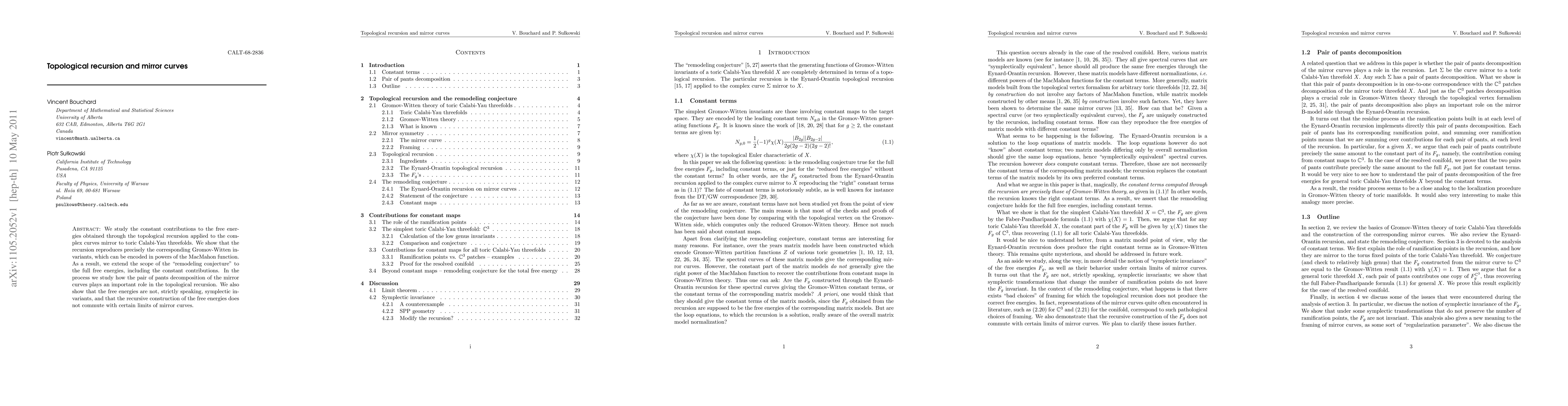 This paper investigates the topological recursion applied to mirror curves of toric Calabi-Yau threefolds, demonstrating its ability to reproduce Gromov-Witten invariants encoded in MacMahon functions. It extends the "remodeling conjecture" to include constant contributions in full free energies and highlights the role of pair of pants decomposition in the recursion.