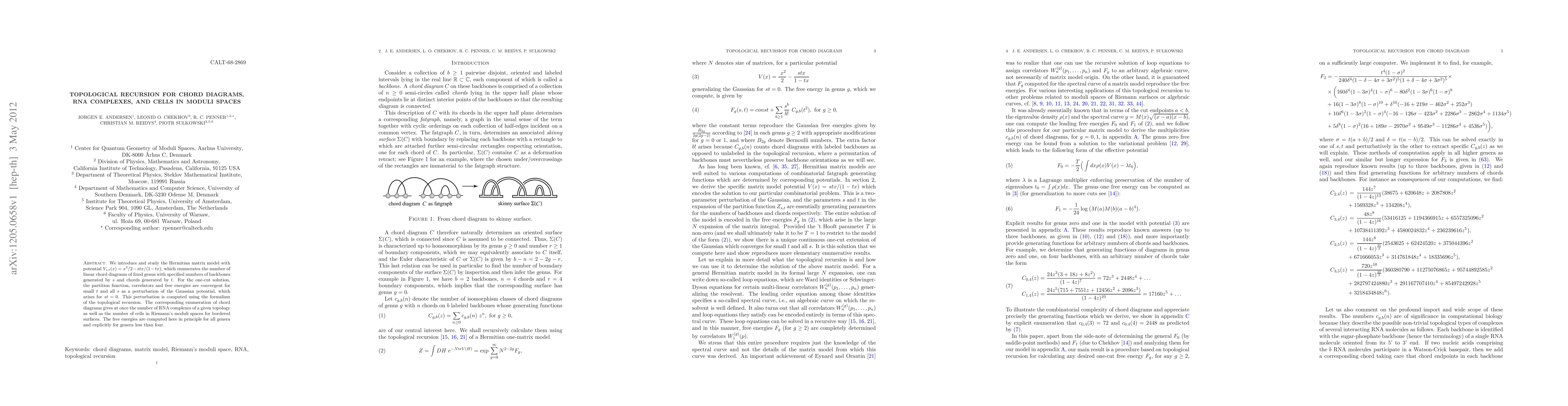 This paper introduces a Hermitian matrix model to enumerate chord diagrams, which corresponds to RNA complexes and cells in moduli spaces. The topological recursion method is used to compute partition functions and free energies, showing convergence for small perturbations from the Gaussian potential.