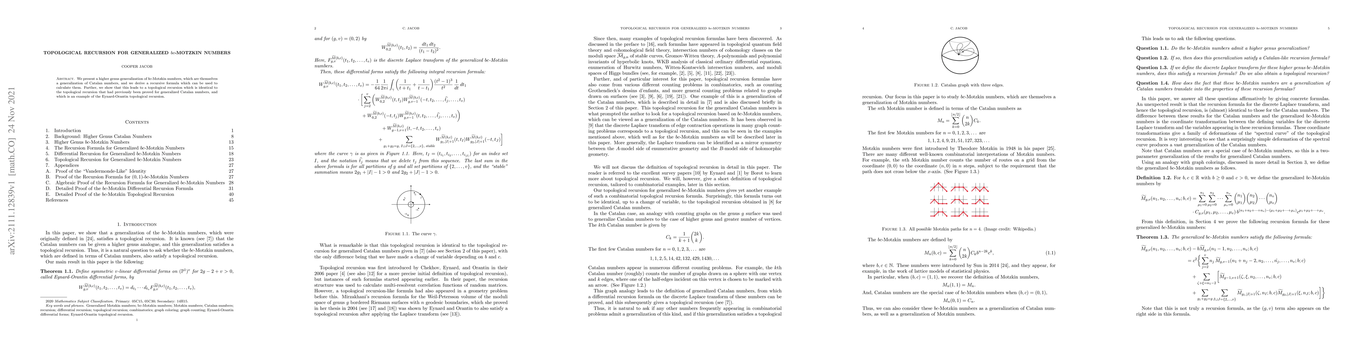 This paper generalizes $bc$-Motzkin numbers to higher genus and derives a recursive formula for their calculation. It establishes a topological recursion equivalent to that for generalized Catalan numbers, exemplifying the Eynard-Orantin framework.