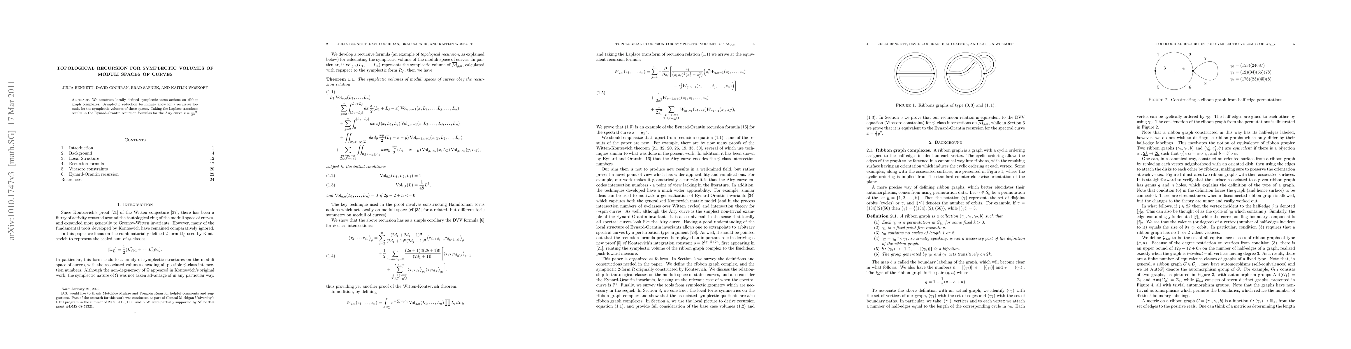 This paper develops a method for calculating symplectic volumes of moduli spaces of curves using topological recursion and symplectic reduction, leading to the Eynard-Orantin recursion formulas for the Airy curve x = y^2 / 2. The approach involves constructing symplectic torus actions on ribbon graph complexes and applying Laplace transforms to derive recursive relationships.