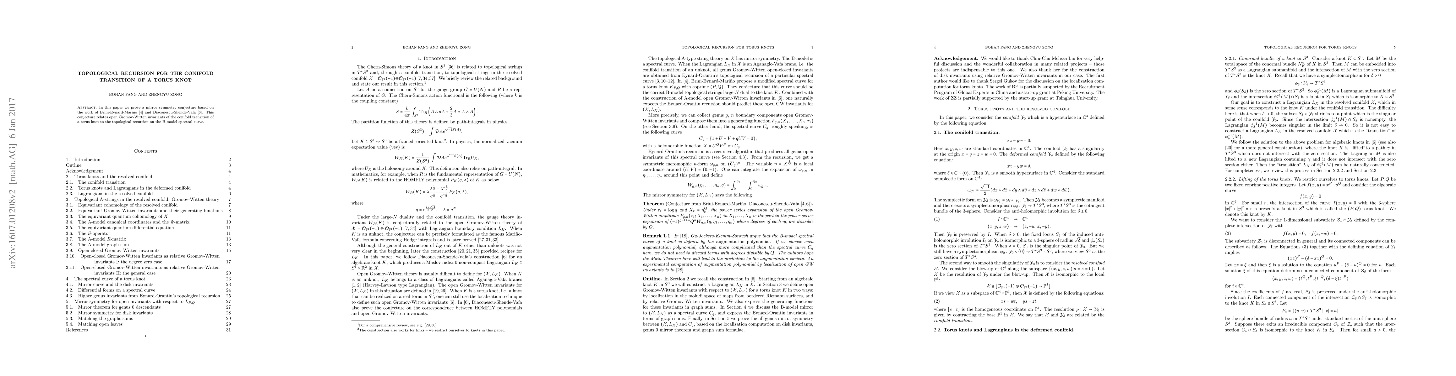 This paper proves a mirror symmetry conjecture linking open Gromov-Witten invariants of a torus knot's conifold transition to topological recursion on the B-model spectral curve, based on prior work by Brini-Eynard-Mari\~no and Diaconescu-Shende-Vafa.