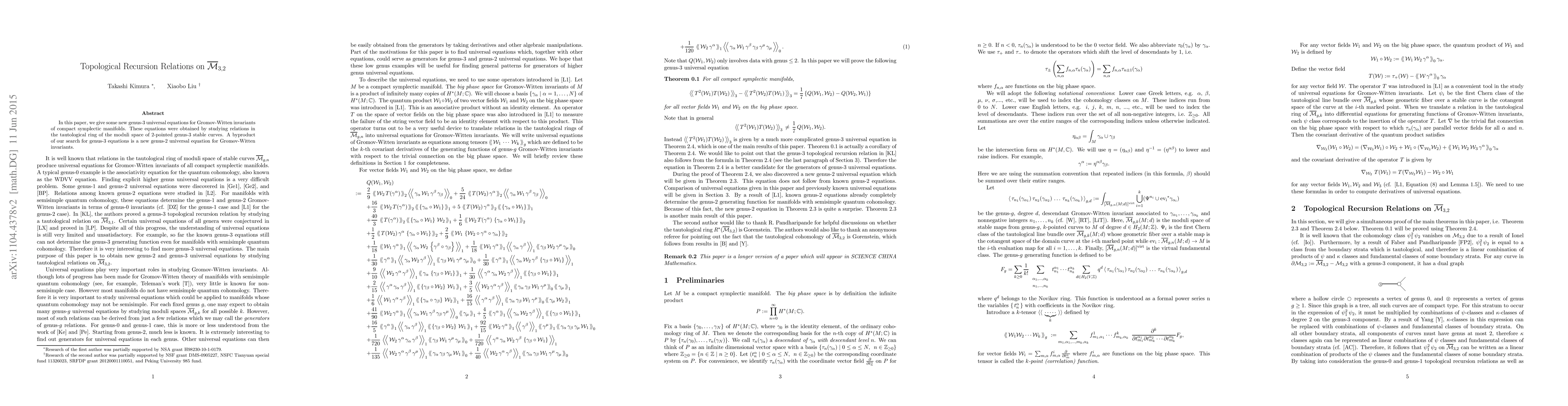 In this paper, we give some new genus-3 universal equations for Gromov-Witten invariants of compact symplectic manifolds. These equations were obtained by studying new relations in the tautological ring of the moduli space of 2-pointed genus-3 stable curves. A byproduct of our search for genus-3 equations is a new genus-2 universal equation for Gromov-Witten invariants.