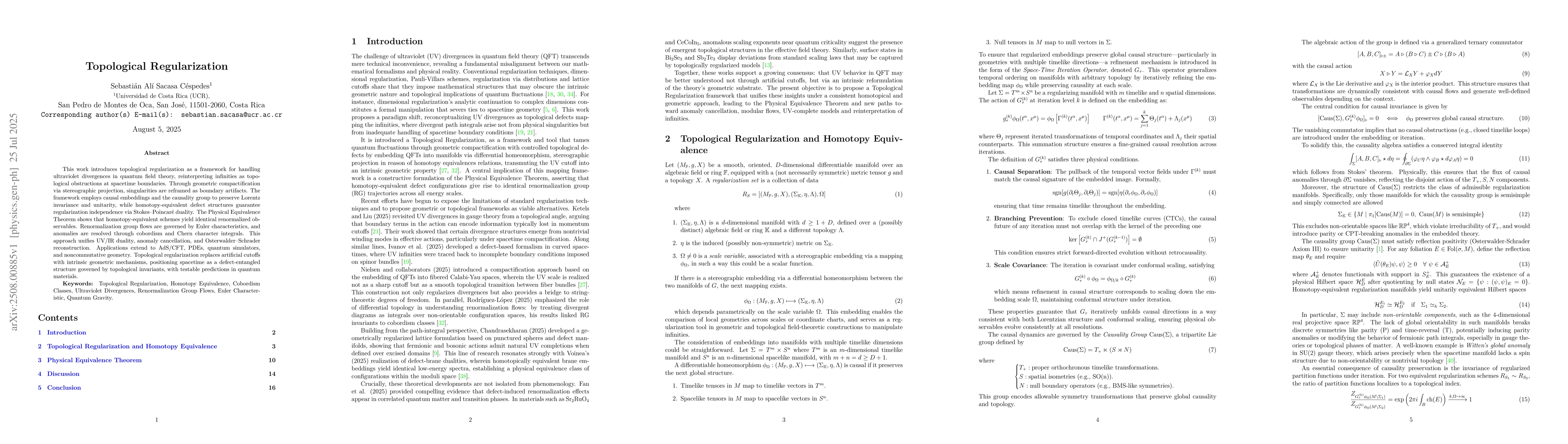 This work introduces topological regularization as a framework for handling ultraviolet divergences in quantum field theory, reinterpreting infinities as topological obstructions at spacetime boundaries. Through geometric compactification via stereographic projection, singularities are reframed as boundary artifacts. The framework employs causal embeddings and the causality group to preserve Lorentz invariance and unitarity, while homotopy-equivalent defect structures guarantee regularization independence via Stokes-Poincar\'e duality. The Physical Equivalence Theorem shows that homotopy-equivalent schemes yield identical renormalized observables. Renormalization group flows are governed by Euler characteristics, and anomalies are resolved through cobordism and Chern character integrals. This approach unifies UV/IR duality, anomaly cancellation, and Osterwalder-Schrader reconstruction. Applications extend to AdS/CFT, PDEs, quantum simulators, and noncommutative geometry. Topological regularization replaces artificial cutoffs with intrinsic geometric mechanisms, positioning spacetime as a defect-entangled structure governed by topological invariants, with testable predictions in quantum materials.