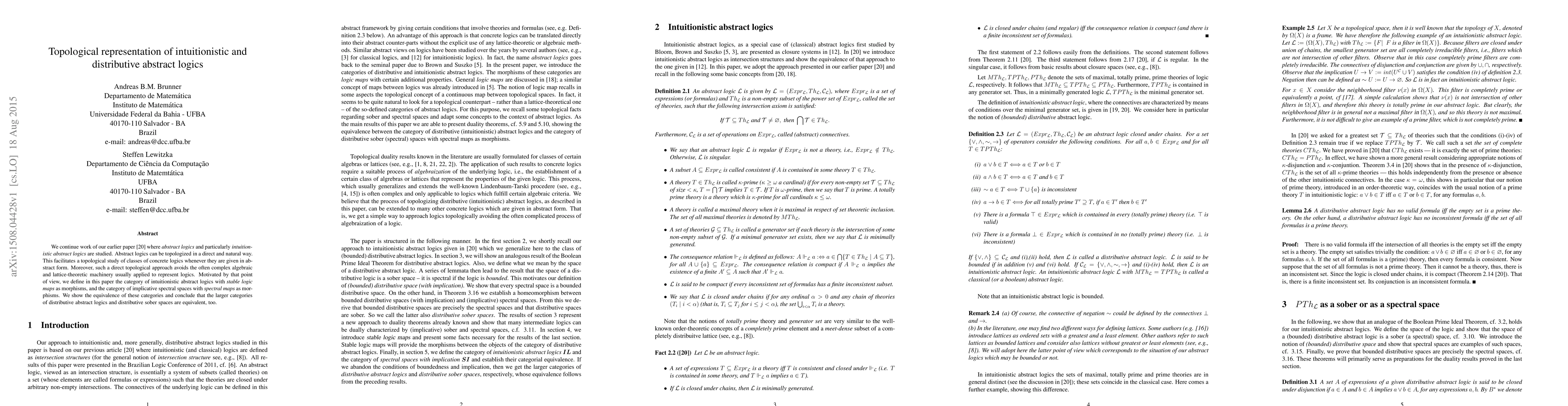 This paper extends previous work on abstract logics, specifically intuitionistic ones, by introducing topological representations. It establishes equivalence between the category of intuitionistic abstract logics and implicative spectral spaces, and extends this to distributive abstract logics and distributive sober spaces, offering a simpler topological approach over traditional algebraic methods.