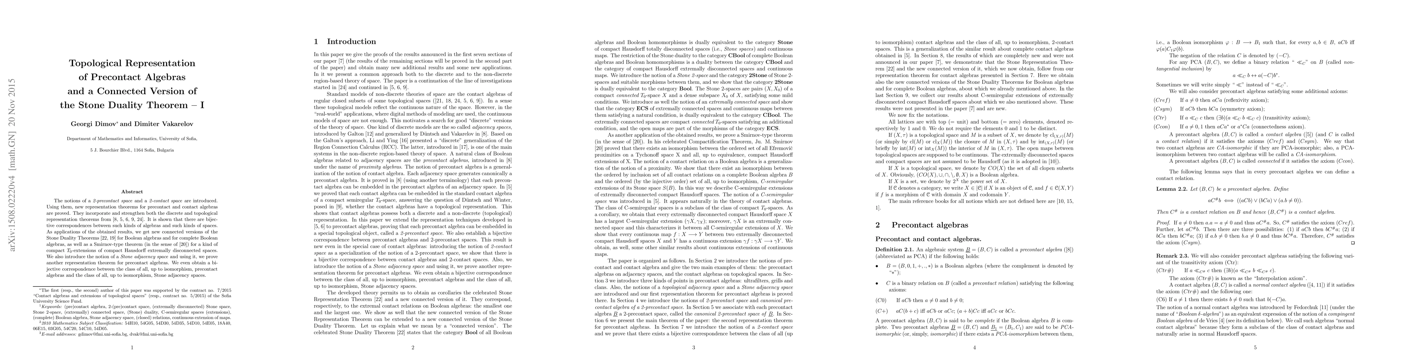 The notions of a {\em 2-precontact space}\/ and a {\em 2-contact space}\/ are introduced. Using them, new representation theorems for precontact and contact algebras are proved. It is shown that there are bijective correspondences between such kinds of algebras and such kinds of spaces. As applications of the obtained results, we get new connected versions of the Stone Duality Theorems for Boolean algebras and for complete Boolean algebras, as well as a Smirnov-type theorem for a kind of compact $T_0$-extensions of compact Hausdorff extremally disconnected spaces. We also introduce the notion of a {\em Stone adjacency space}\/ and using it, we prove another representation theorem for precontact algebras. We even obtain a bijective correspondence between the class of all, up to isomorphism, precontact algebras and the class of all, up to isomorphism, Stone adjacency spaces.