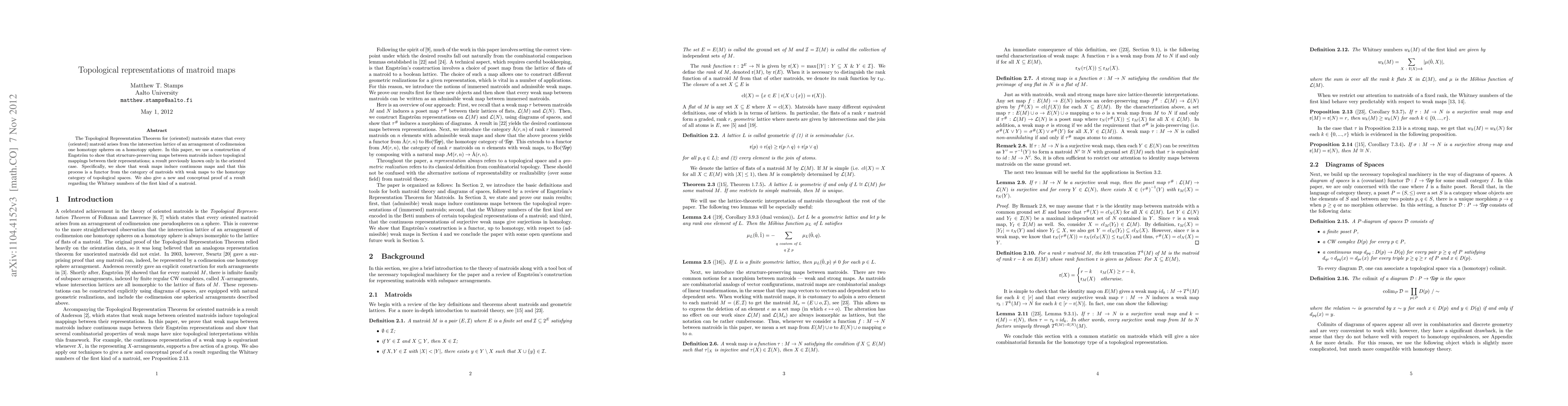 This paper demonstrates that structure-preserving maps between matroids induce topological mappings between their topological representations, extending previous results known only for oriented matroids. The authors provide a new proof for the Whitney numbers of the first kind using Engström's construction.