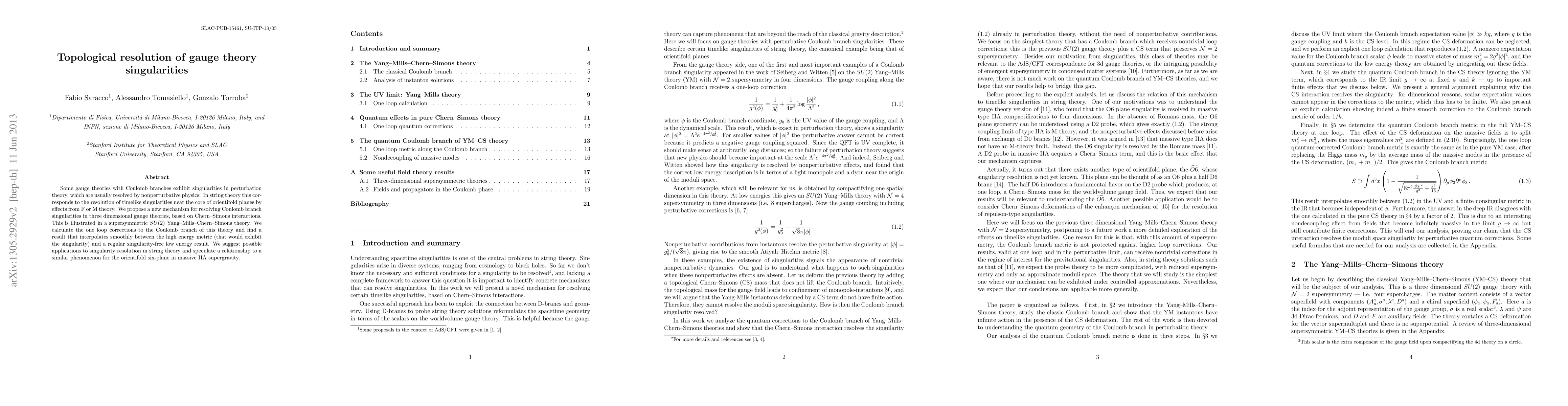 This paper proposes a novel mechanism using Chern-Simons interactions to resolve singularities in three-dimensional gauge theories, demonstrated through calculations in supersymmetric SU(2) Yang-Mills-Chern-Simons theory, and suggests implications for singularity resolution in string theory. The findings indicate a smooth interpolation between high and low energy metrics.