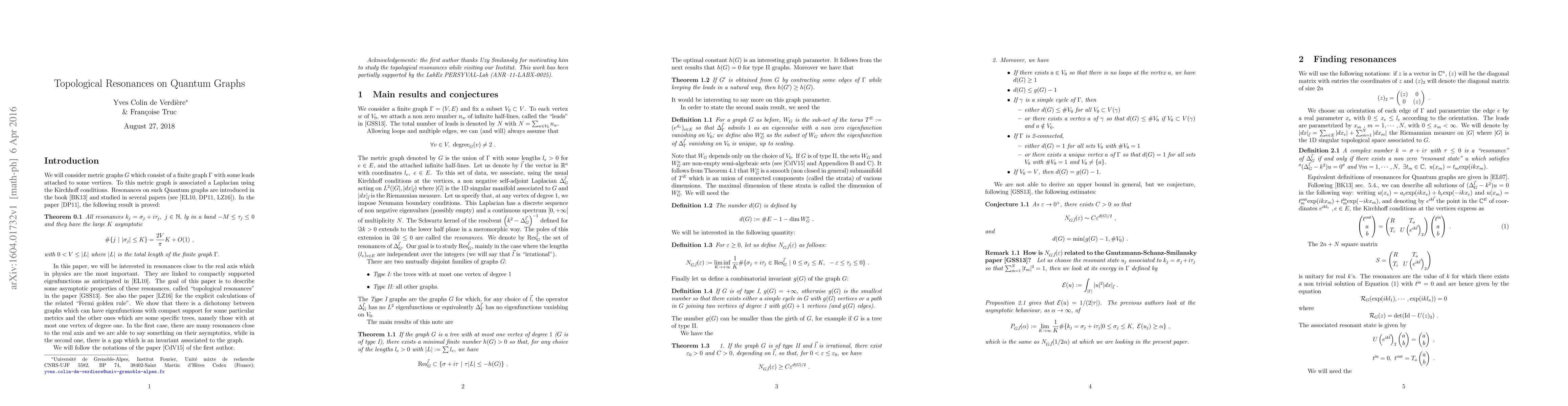 In this paper, we try to put the results of Smilansky and al. on "Topological resonances" on a mathematical basis.A key role in the asymptotic of resonances near the real axis for Quantum Graphs is played by the set of metrics for which there exists compactly supported eigenfunctions. We give several estimateof the dimension of this semi-algebraic set, in particular in terms of the girth of the graph. The case oftrees is also discussed.