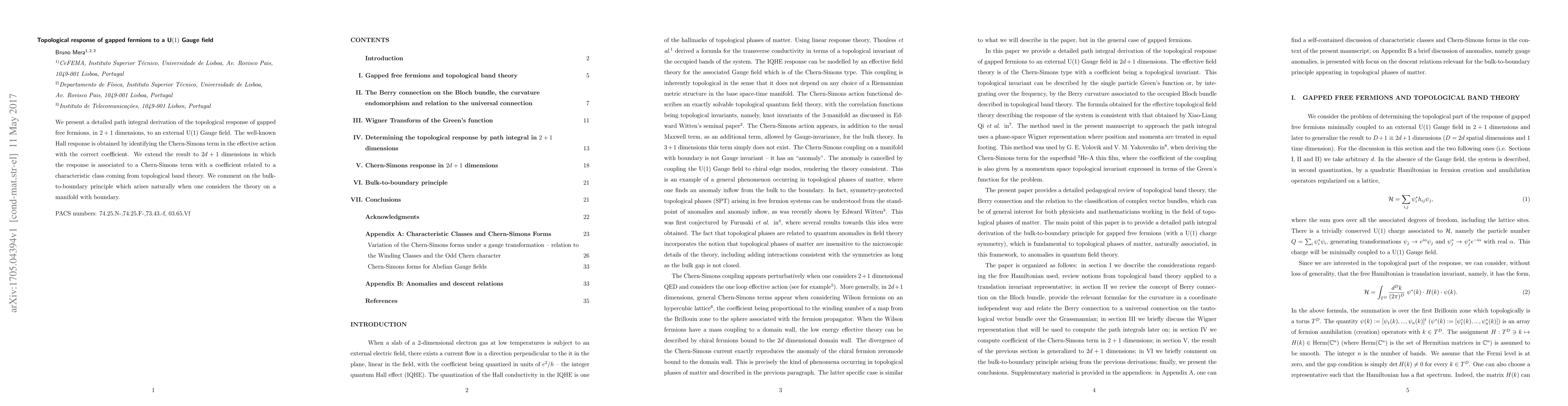 This paper derives the topological response of gapped fermions in $2+1$ dimensions to a $\text{U}(1)$ gauge field using path integral methods, identifying the Chern-Simons term in the effective action. It extends the findings to $2d+1$ dimensions, linking the response to a topological band theory characteristic class, and discusses the bulk-to-boundary principle.