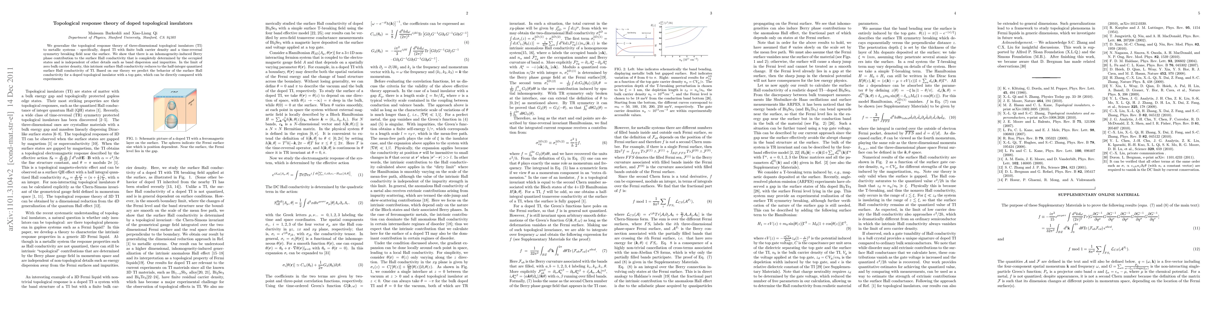 This paper extends topological response theory to doped topological insulators, revealing an inhomogeneity-induced Berry phase contribution to surface Hall conductivity that depends solely on occupied states, predicting its behavior for systems with applied surface fields for experimental verification.