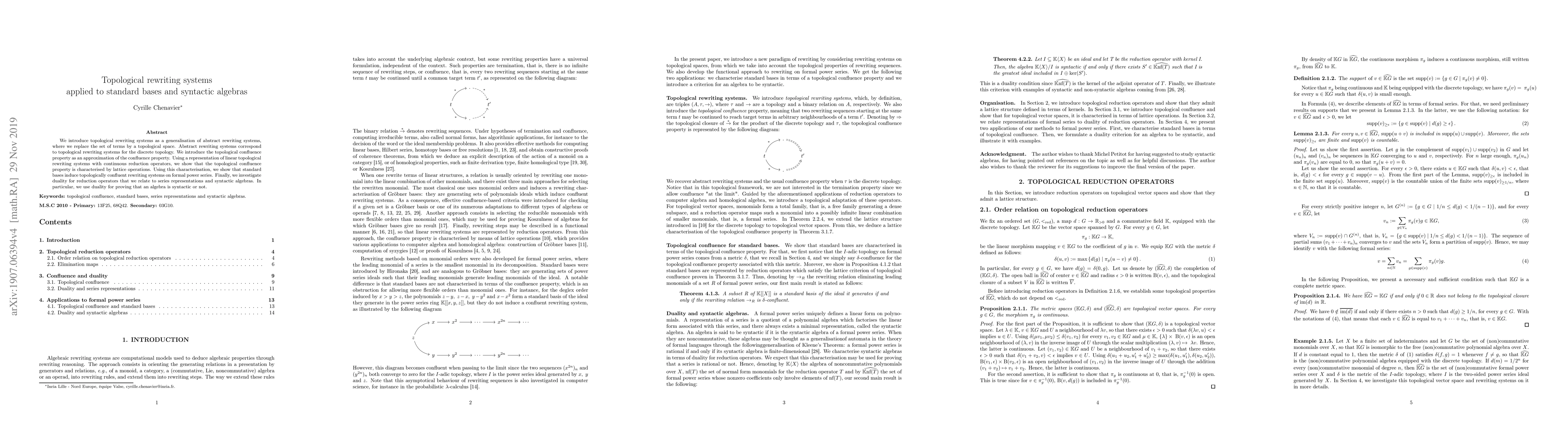 This paper proposes a functional description of rewriting systems on topological vector spaces, introducing the topological confluence property and showing its characterization through lattice operations. It relates these operations to standard bases and syntactic algebras, proving the duality of reduction operators to determine syntactic properties of algebras.
