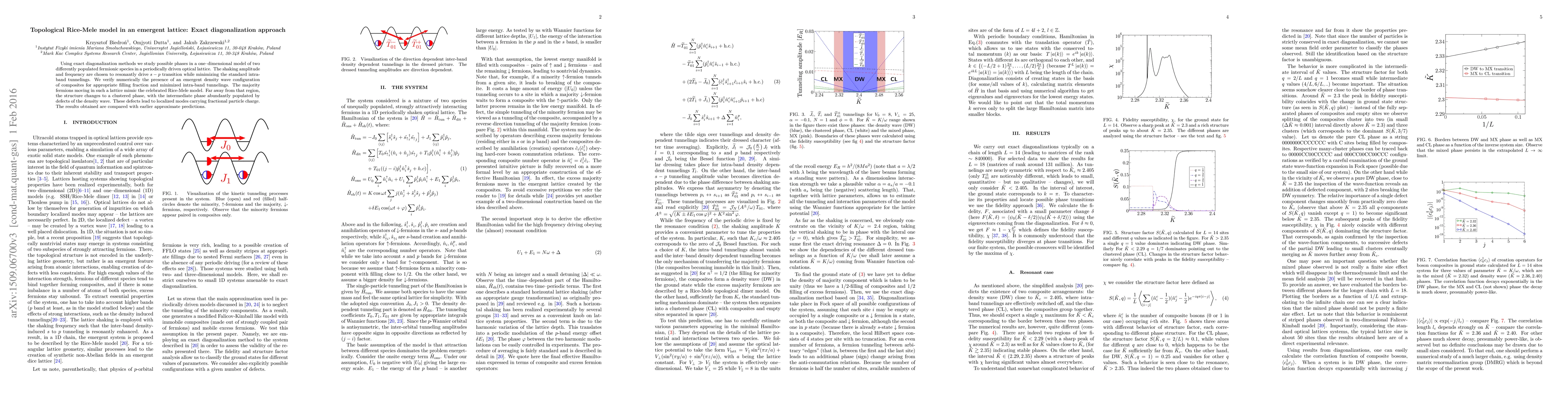 Using exact diagonalization methods we study possible phases in a one dimensional model of two differently populated fermionic species in a periodically driven optical lattice. The shaking amplitude and frequency are chosen to resonantly drive $s-p$ transition while minimizing the standard intraband tunnelings. We numerically verify that in the vicinity of vanishing intraband tunnelings the system, for an appropriate filling, shows an emergent density wave configuration of composites. The majority fermions moving in such a lattice mimic the celebrated Rice-Mele model. Far away from that region structure changes to clustered phase, with intermediate phase abundantly populated by defects of the density wave. These defects lead to loclaized modes carrying fractional particle charge. The results obtained are compared with earlier mean field approximation predictions.