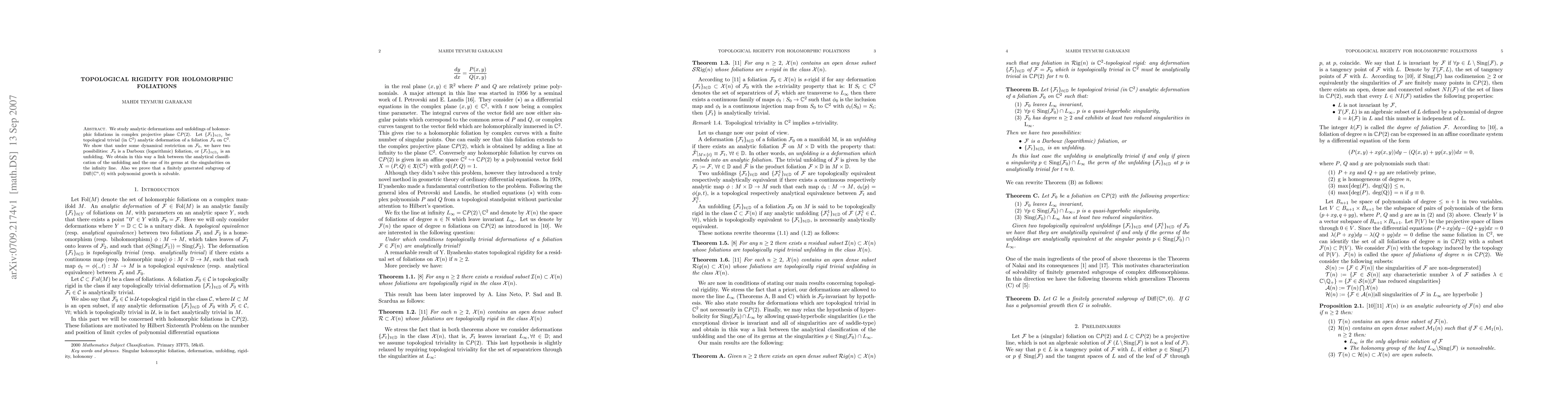 This paper studies the topological properties of holomorphic foliations in complex projective plane $ ext{CP}(2)$, showing a link between their analytical classification and that of their unfoldings.