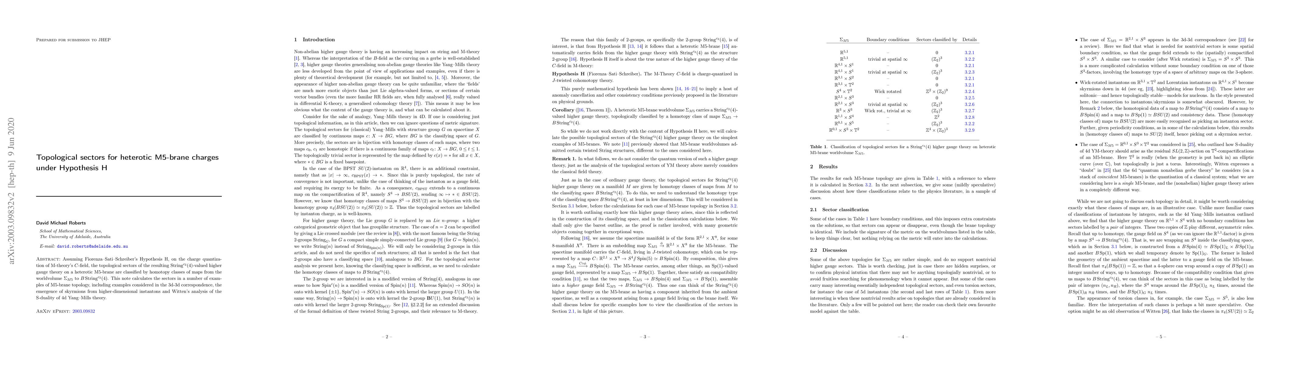 Assuming Fiorenza-Sati-Schreiber's Hypothesis H, on the charge quantization of M-theory's $C$-field, the topological sectors of the resulting $String^{c_2}(4)$-valued higher gauge theory on a heterotic M5-brane are classified by homotopy classes of maps from the worldvolume $\Sigma_{M5}$ to $BString^{c_2}(4)$. This note calculates the sectors in a number of examples of M5-brane topology, including examples considered in the 3d-3d correspondence, the emergence of skyrmions from higher-dimensional instantons and Witten's analysis of the S-duality of 4d Yang-Mills theory.