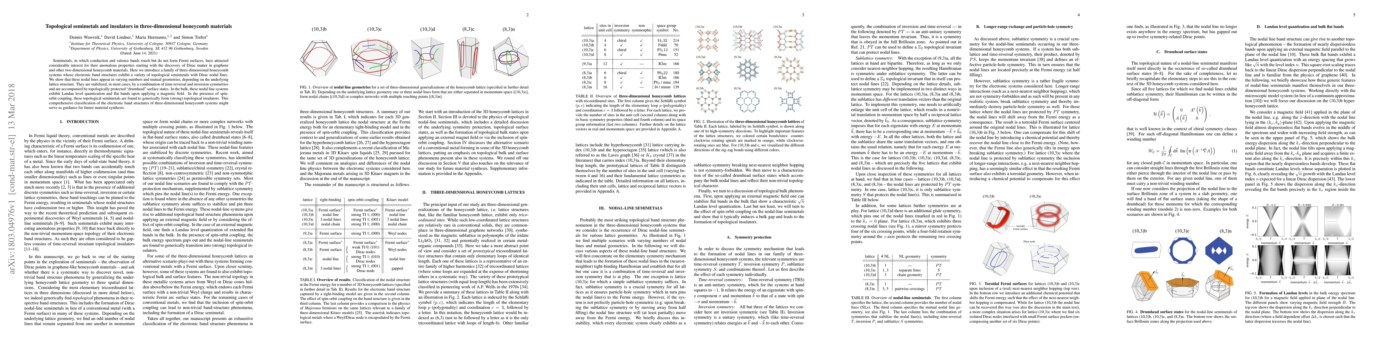 This paper classifies three-dimensional honeycomb materials with topological semimetals featuring Dirac nodal lines, stabilized by time-reversal and inversion symmetries, and accompanied by topologically protected surface states. It highlights their potential to form topological insulators under spin-orbit coupling.