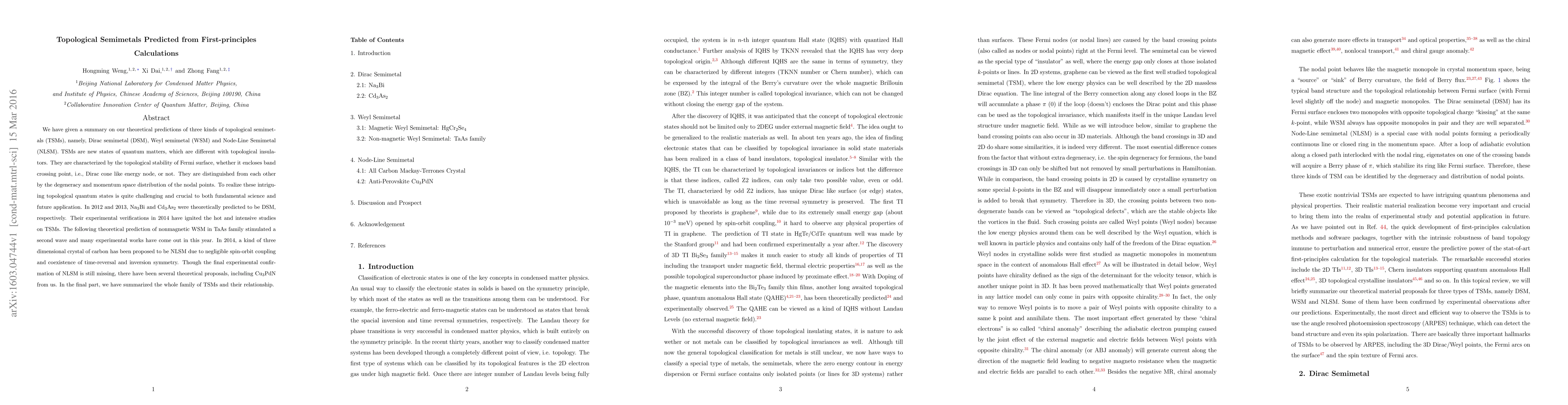 This paper presents theoretical predictions of three types of topological semimetals (TSMs): Dirac, Weyl, and Node-Line semimetals, highlighting their unique topological properties and the significance of their experimental verification. It also discusses the potential applications and fundamental science implications of these quantum states.