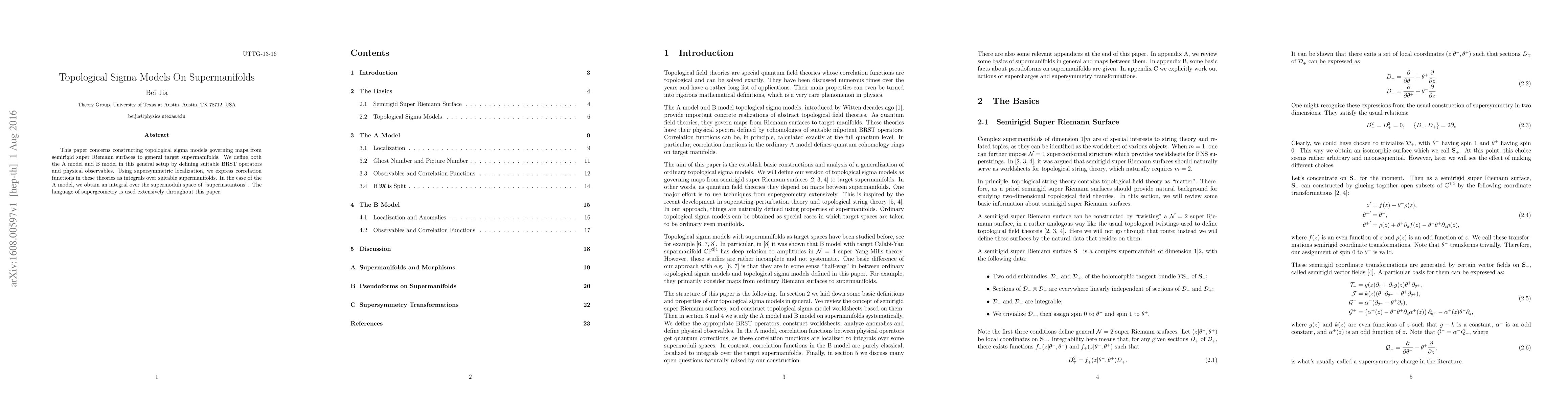 This paper constructs topological sigma models for maps from semirigid super Riemann surfaces to target supermanifolds, defining both A and B models via BRST operators and observables. Correlation functions are expressed as integrals over supermanifolds using supersymmetric localization.