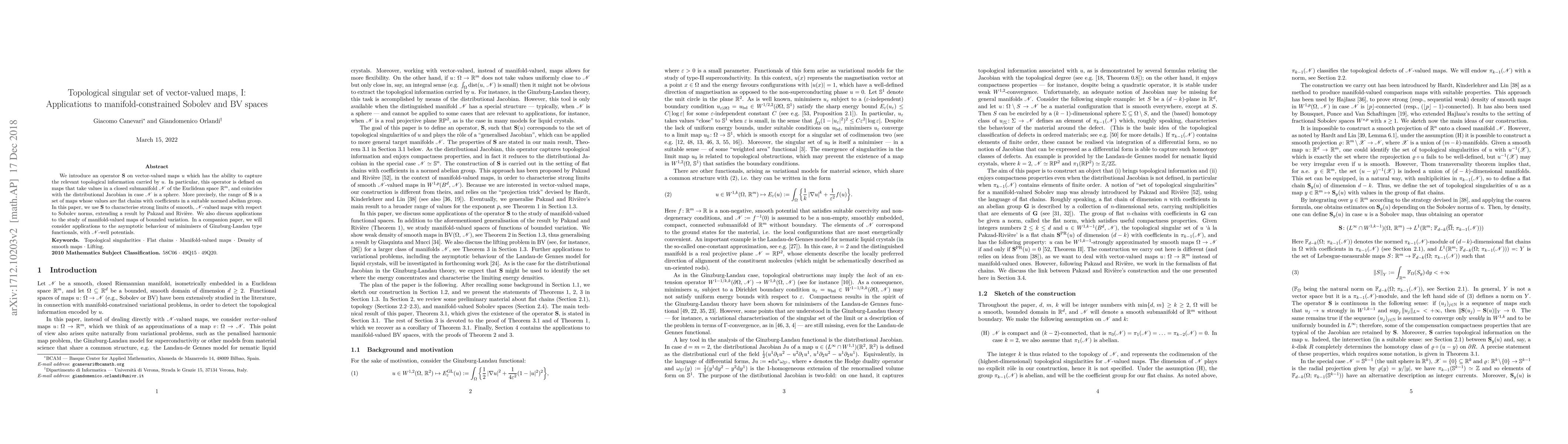 We introduce an operator $\mathbf{S}$ on vector-valued maps $u$ which has the ability to capture the relevant topological information carried by $u$. In particular, this operator is defined on maps that take values in a closed submanifold $N$ of the Euclidean space $\mathbb{R}^m$, and coincides with the distributional Jacobian in case $N$ is a sphere. The range of $\mathbf{S}$ is a set of maps whose values are flat chains with coefficients in a suitable normed abelian group. In this paper, we use $\mathbf{S}$ to characterise strong limits of smooth, $N$-valued maps with respect to Sobolev norms, extending a result by Pakzad and Rivi\`ere. We also discuss applications to the study of manifold-valued maps of bounded variation. In a companion paper, we will consider applications to the asymptotic behaviour of minimisers of Ginzburg-Landau type functionals.
