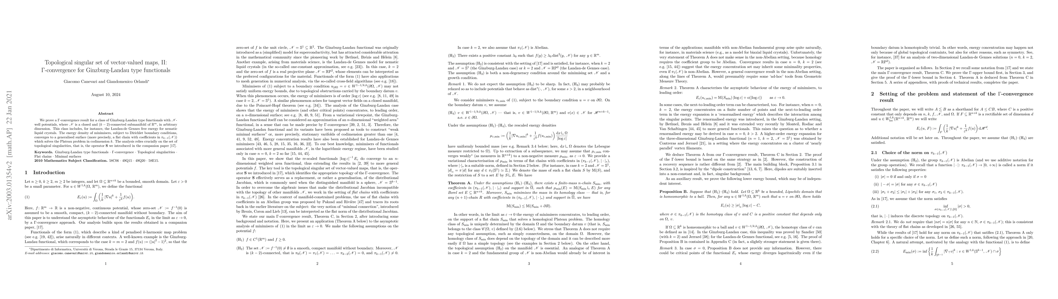 We prove a $\Gamma$-convergence result for a class of Ginzburg-Landau type functionals with $\mathcal{N}$-well potentials, where $\mathcal{N}$ is a closed and $(k-2)$-connected submanifold of $\mathbb{R}^m$, in arbitrary dimension. This class includes, for instance, the Landau-de Gennes free energy for nematic liquid crystals. The energy density of minimisers, subject to Dirichlet boundary conditions, converges to a generalised surface (more precisely, a flat chain with coefficients in $\pi_{k-1}(\mathcal{N})$) which solves the Plateau problem in codimension $k$. The analysis relies crucially on the set of topological singularities, that is, the operator $\mathbf{S}$ we introduced in the companion paper arXiv:1712.10203.