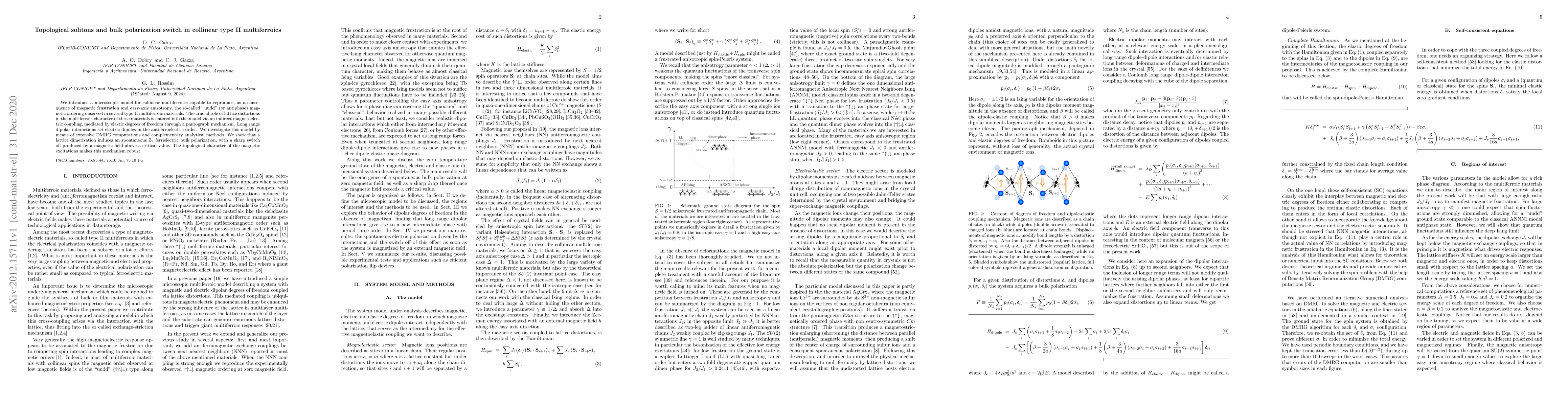 We introduce a microscopic model for collinear multiferroics capable to reproduce, as a consequence of magnetic frustration and easy-axis anisotropy, the so-called "uudd" (or antiphase) magnetic ordering observed in several type II multiferroic materials. The crucial role of lattice distortions in the multiferroic character of these materials is entered into the model via an indirect magnetoelectric coupling, mediated by elastic degrees of freedom through a pantograph mechanism. Long range dipolar interactions set electric dipoles in the antiferroelectric order. We investigate this model by means of extensive DMRG computations and complementary analytical methods. We show that a lattice dimerization induces a spontaneous Z2 ferrielectric bulk polarization, with a sharp switch off produced by a magnetic field above a critical value. The topological character of the magnetic excitations makes this mechanism robust.