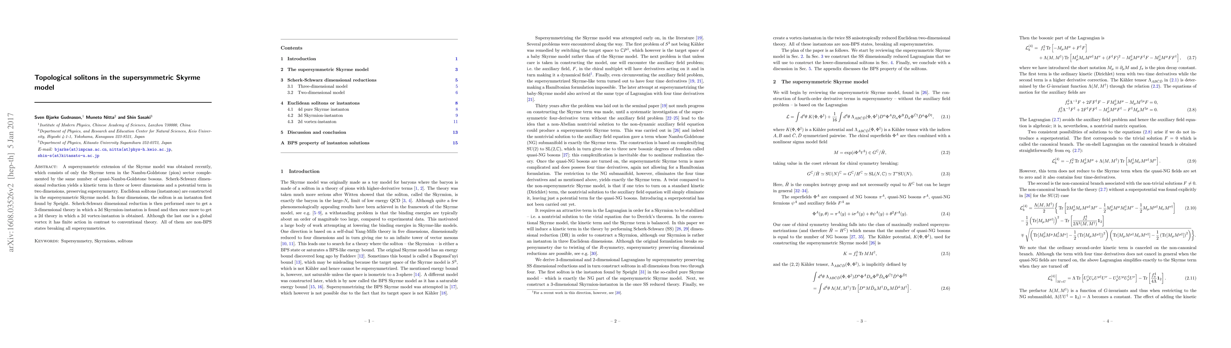 This paper explores a supersymmetric extension of the Skyrme model, constructing Euclidean solitons (instantons) in various dimensions through Scherk-Schwarz dimensional reduction. The study reveals non-BPS solitons in four, three, and two dimensions, including a globally stable vortex-instanton in two dimensions with finite action.