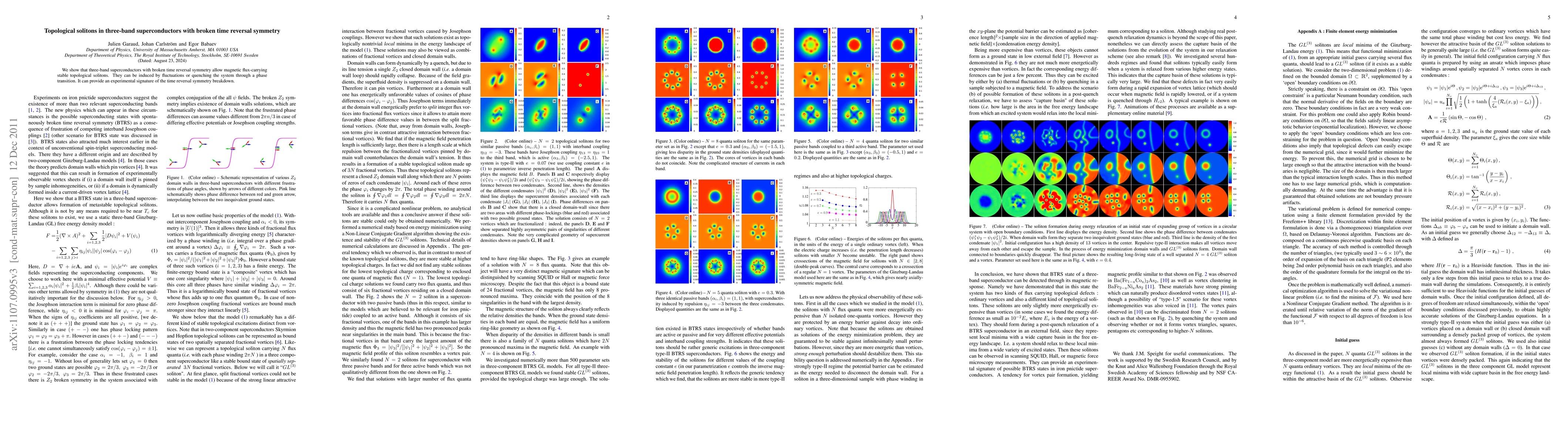 This paper investigates three-band superconductors with broken time reversal symmetry, revealing the existence of stable topological solitons with slightly higher energy than ordinary vortices. These solitons can be induced by system fluctuations or phase transitions, offering a potential experimental signature of symmetry breakdown.