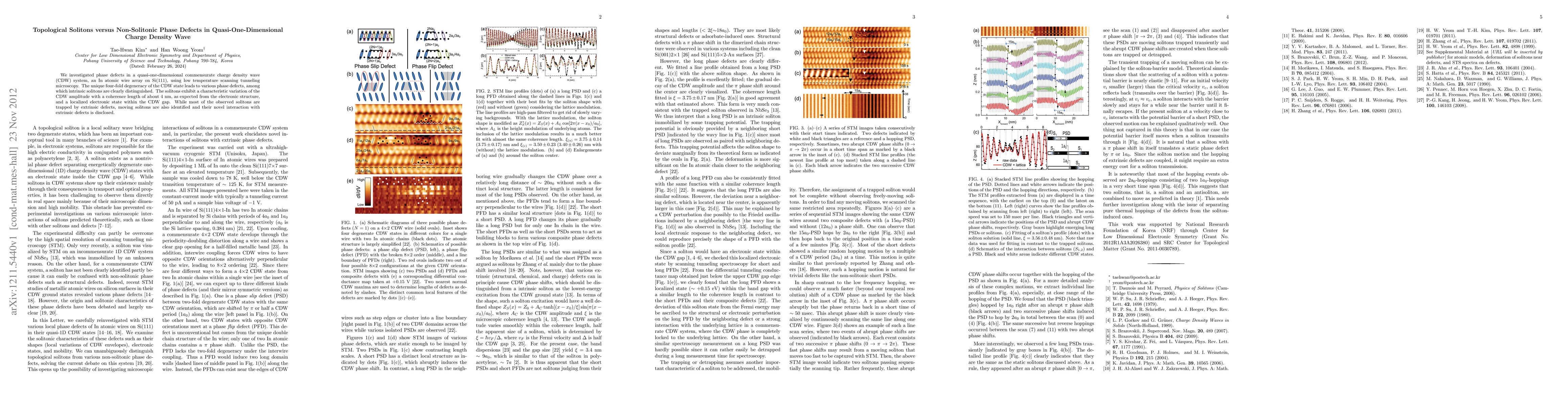 This study uses low-temperature scanning tunneling microscopy to investigate phase defects in a quasi-one-dimensional charge density wave system, identifying intrinsic topological solitons with a distinct amplitude variation and localized electronic states, alongside interactions with extrinsic defects. Most solitons are trapped by extrinsic defects, but mobile solitons and their interactions are also observed.