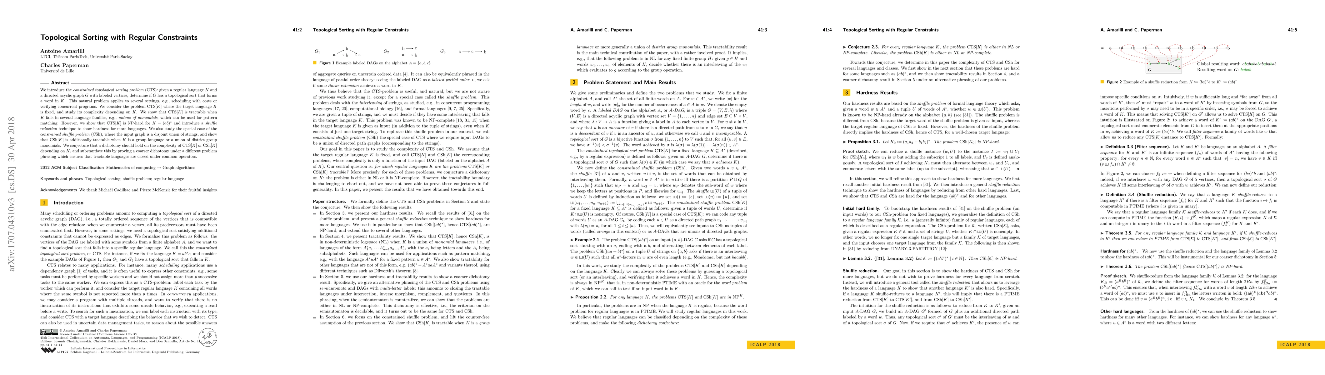 We introduce the constrained topological sorting problem (CTS): given a regular language K and a directed acyclic graph G with labeled vertices, determine if G has a topological sort that forms a word in K. This natural problem applies to several settings, e.g., scheduling with costs or verifying concurrent programs. We consider the problem CTS[K] where the target language K is fixed, and study its complexity depending on K. We show that CTS[K] is tractable when K falls in several language families, e.g., unions of monomials, which can be used for pattern matching. However, we show that CTS[K] is NP-hard for K = (ab)^* and introduce a shuffle reduction technique to show hardness for more languages. We also study the special case of the constrained shuffle problem (CSh), where the input graph is a disjoint union of strings, and show that CSh[K] is additionally tractable when K is a group language or a union of district group monomials. We conjecture that a dichotomy should hold on the complexity of CTS[K] or CSh[K] depending on K, and substantiate this by proving a coarser dichotomy under a different problem phrasing which ensures that tractable languages are closed under common operators.