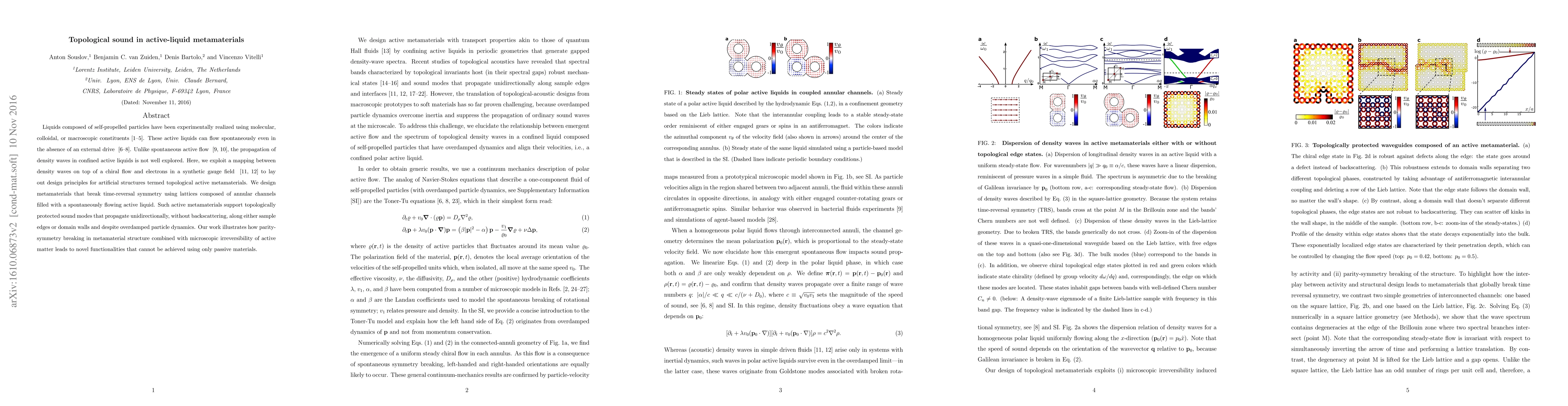Liquids composed of self-propelled particles have been experimentally realized using molecular, colloidal, or macroscopic constituents. These active liquids can flow spontaneously even in the absence of an external drive. Unlike spontaneous active flow, the propagation of density waves in confined active liquids is not well explored. Here, we exploit a mapping between density waves on top of a chiral flow and electrons in a synthetic gauge field to lay out design principles for artificial structures termed topological active metamaterials. We design metamaterials that break time-reversal symmetry using lattices composed of annular channels filled with a spontaneously flowing active liquid. Such active metamaterials support topologically protected sound modes that propagate unidirectionally, without backscattering, along either sample edges or domain walls and despite overdamped particle dynamics. Our work illustrates how parity-symmetry breaking in metamaterial structure combined with microscopic irreversibility of active matter leads to novel functionalities that cannot be achieved using only passive materials.