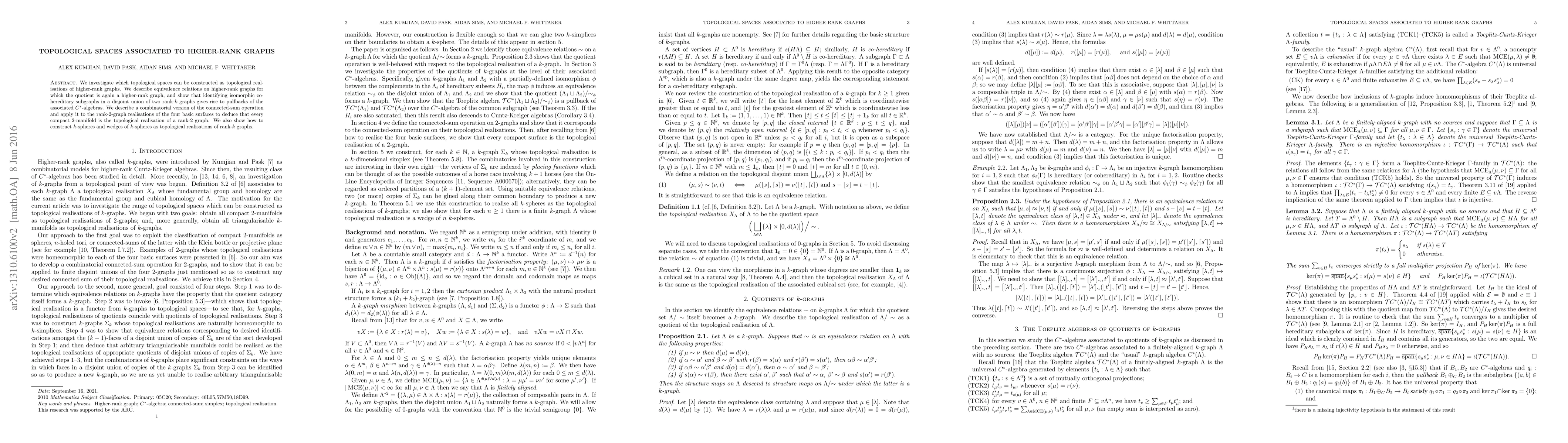 We investigate which topological spaces can be constructed as topological realisations of higher-rank graphs. We describe equivalence relations on higher-rank graphs for which the quotient is again a higher-rank graph, and show that identifying isomorphic co-hereditary subgraphs in a disjoint union of two rank-$k$ graphs gives rise to pullbacks of the associated $C^*$-algebras. We describe a combinatorial version of the connected-sum operation and apply it to the rank-2-graph realisations of the four basic surfaces to deduce that every compact 2-manifold is the topological realisation of a rank-2 graph. We also show how to construct $k$-spheres and wedges of $k$-spheres as topological realisations of rank-$k$ graphs.