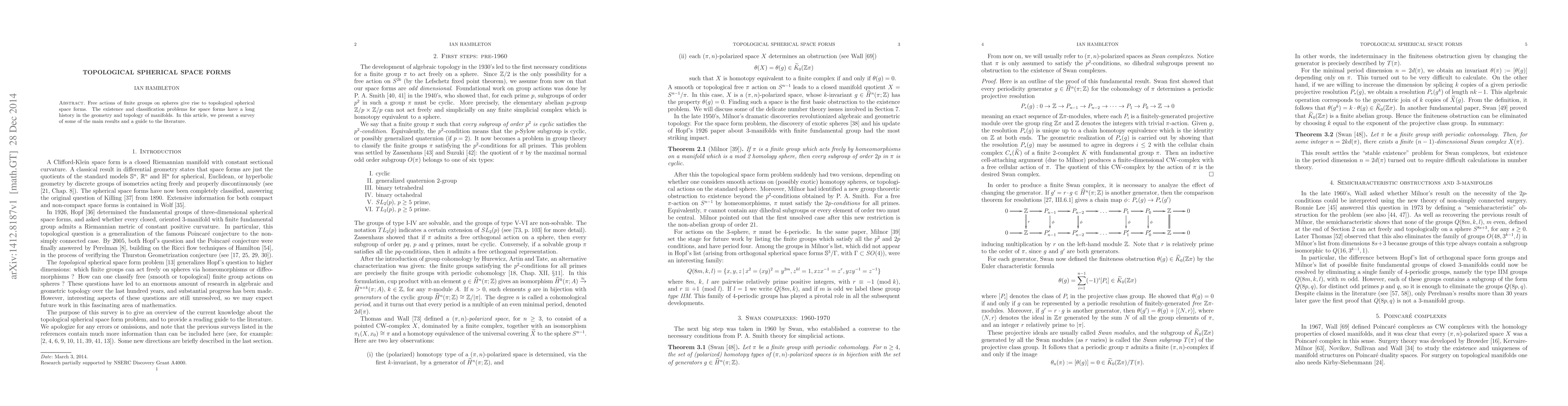 This paper surveys the classification of topological spherical space forms, which arise from free actions of finite groups on spheres, and provides a guide to the extensive literature on this topic in the geometry and topology of manifolds.
