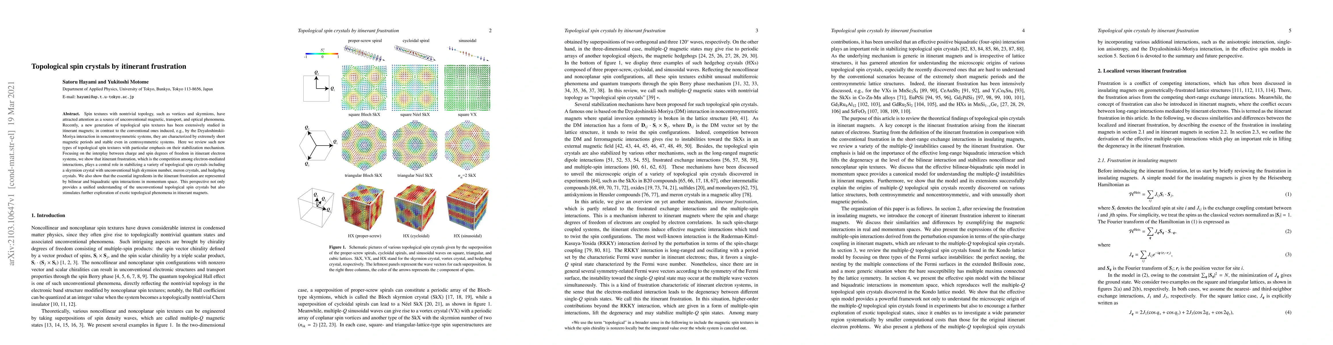 Spin textures with nontrivial topology, such as vortices and skyrmions, have attracted attention as a source of unconventional magnetic, transport, and optical phenomena. Recently, a new generation of topological spin textures has been extensively studied in itinerant magnets; in contrast to the conventional ones induced, e.g., by the Dzyaloshinskii-Moriya interaction in noncentrosymmetric systems, they are characterized by extremely short magnetic periods and stable even in centrosymmetric systems. Here we review such new types of topological spin textures with particular emphasis on their stabilization mechanism. Focusing on the interplay between charge and spin degrees of freedom in itinerant electron systems, we show that itinerant frustration, which is the competition among electron-mediated interactions, plays a central role in stabilizing a variety of topological spin crystals including a skyrmion crystal with unconventional high skyrmion number, meron crystals, and hedgehog crystals. We also show that the essential ingredients in the itinerant frustration are represented by bilinear and biquadratic spin interactions in momentum space. This perspective not only provides a unified understanding of the unconventional topological spin crystals but also stimulates further exploration of exotic topological phenomena in itinerant magnets.