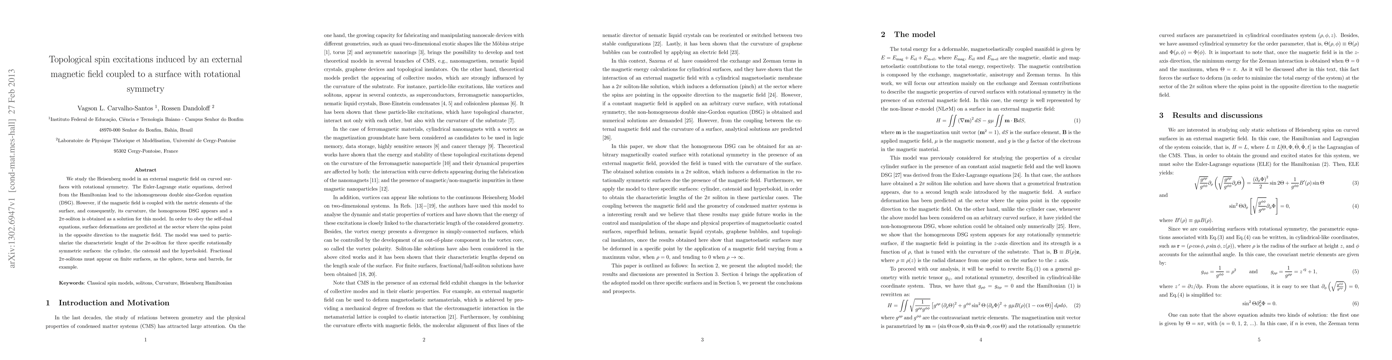 We study the Heisenberg model in an external magnetic field on curved surfaces with rotational symmetry. The Euler-Lagrange static equations, derived from the Hamiltonian lead to the inhomogeneous double sine-Gordon equation (DSG). However, if the magnetic field is coupled with the metric elements of the surface, and consequently, its curvature, the homogeneous DSG appears and a $2\pi$-soliton is obtained as a solution for this model. In order to obey the self-dual equations, surface deformations are predicted at the sector where the spins point in the opposite direction to the magnetic field. The model was used to particularize the characteristic lenght of the 2$\pi$-soliton for three specific rotationally symmetric surfaces: the cylinder, the catenoid and the hyperboloid. Fractional 2$\pi$-solitons must appear on finite surfaces, as the sphere, torus and barrels, for example.