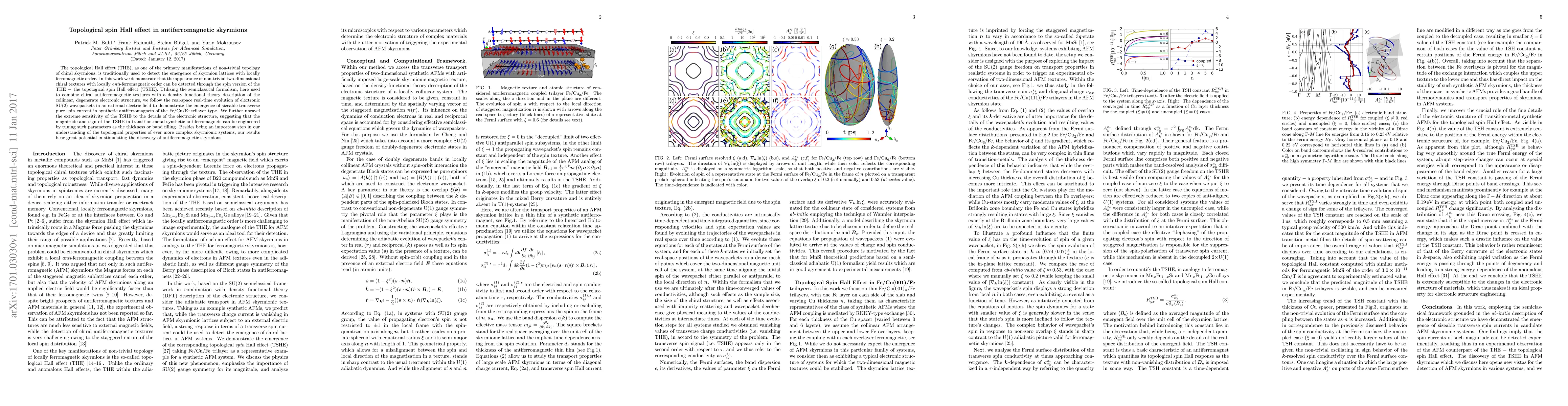 The topological Hall effect (THE), as one of the primary manifestations of non-trivial topology of chiral skyrmions, is traditionally used to detect the emergence of skyrmion lattices with locally ferromagnetic order. In this work we demonstrate that the appearance of non-trivial two-dimensional chiral textures with locally {\it anti}-ferromagnetic order can be detected through the spin version of the THE $-$ the topological spin Hall effect (TSHE). Utilizing the semiclassical formalism, here used to combine chiral antiferromagnetic textures with a density functional theory description of the collinear, degenerate electronic structure, we follow the real-space real-time evolution of electronic SU(2) wavepackets in an external electric field to demonstrate the emergence of sizeable transverse pure spin current in synthetic antiferromagnets of the Fe/Cu/Fe trilayer type. We further unravel the extreme sensitivity of the TSHE to the details of the electronic structure, suggesting that the magnitude and sign of the TSHE in transition-metal synthetic antiferromagnets can be engineered by tuning such parameters as the thickness or band filling. Besides being an important step in our understanding of the topological properties of ever more complex skyrmionic systems, our results bear great potential in stimulating the discovery of antiferromagnetic skyrmions.