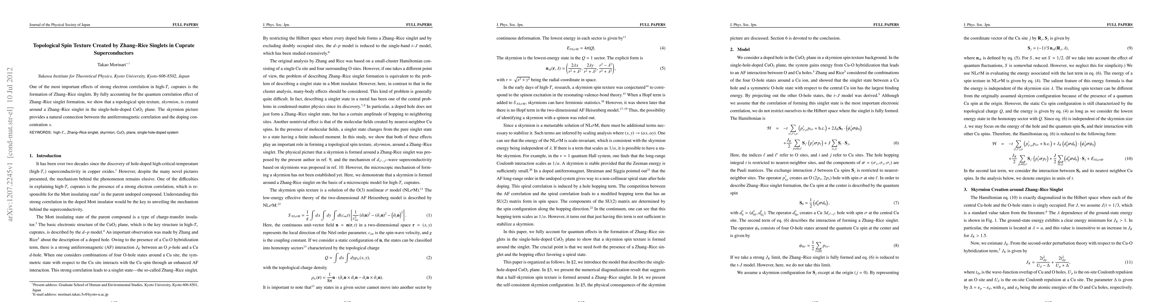 This study demonstrates that Zhang-Rice singlets in cuprate superconductors create a topological spin texture known as a skyrmion in the CuO2 plane. This skyrmion links antiferromagnetic correlation to doping concentration, highlighting the role of quantum correlation in high-Tc superconductivity.