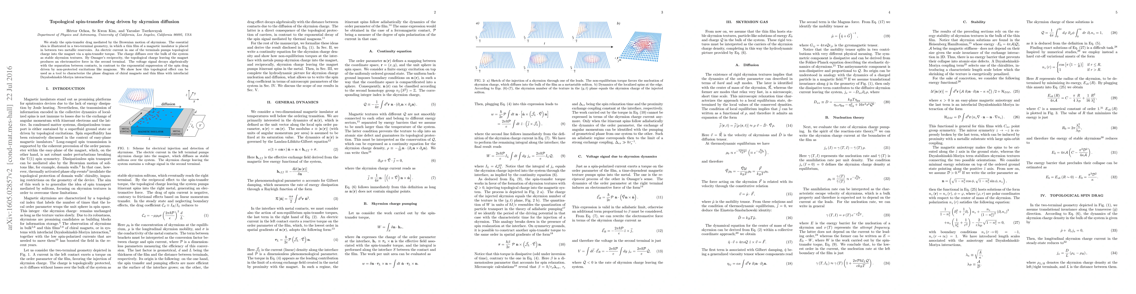 We study the spin-transfer drag mediated by the Brownian motion of skyrmions. The essential idea is illustrated in a two-terminal geometry, in which a thin film of a magnetic insulator is placed in between two metallic reservoirs. An electric current in one of the terminals pumps topological charge into the magnet via a spin-transfer torque. The charge diffuses over the bulk of the system as stable skyrmion textures. By Onsager's reciprocity, the topological charge leaving the magnet produces an electromotive force in the second terminal. The voltage signal decays algebraically with the separation between contacts, in contrast to the exponential suppression of the spin drag driven by non-protected excitations like magnons. We show how this topological effect can be used as a tool to characterize the phase diagram of chiral magnets and thin films with interfacial Dzyaloshinskii-Moriya interactions.